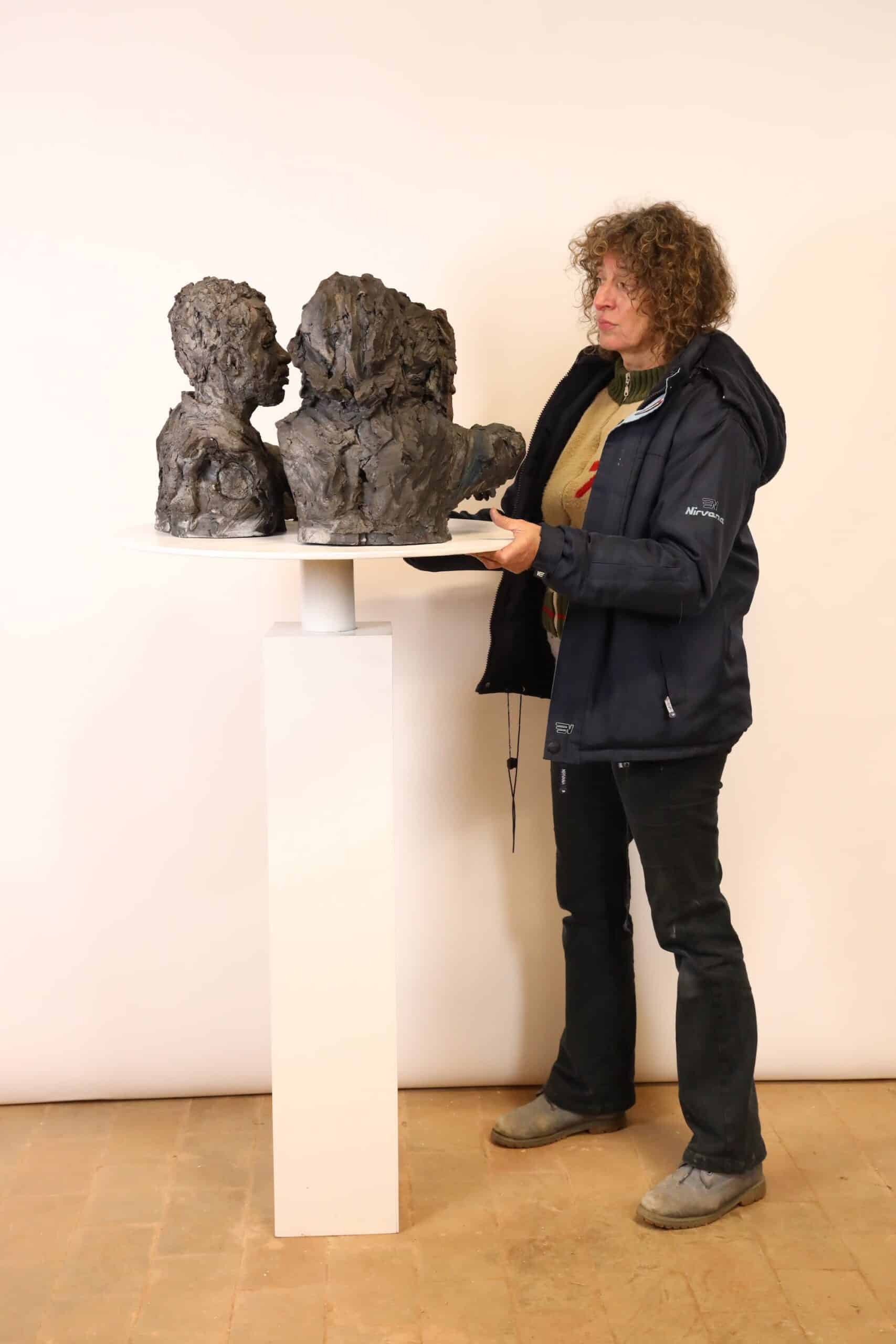 | Description | Sculpture en grès enfumé, résine, pigments, acier |