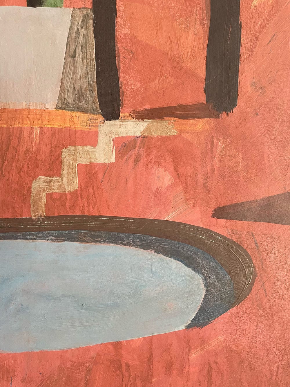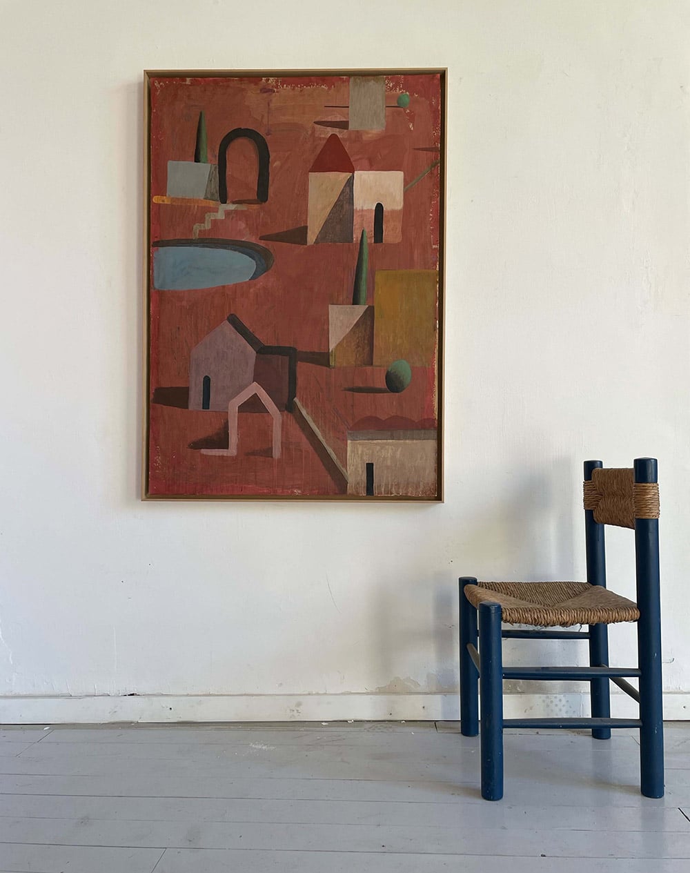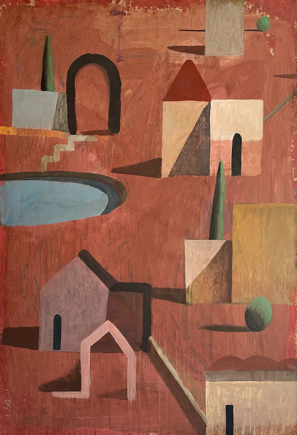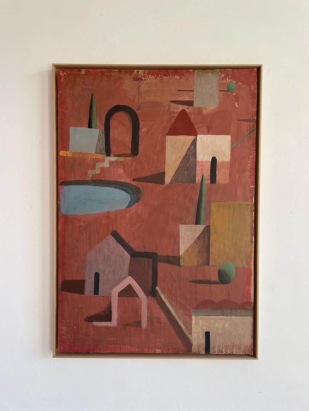Avec ce tableau, l’artiste compose un paysage en adoptant un point de vue aérien sur ce qui ressemble à une place de village : plusieurs habitations sont disposées autour d’un petit bassin. On retrouve ici l’alphabet pictural de l’artiste : constructions réduites à des formes géométriques simples, végétation graphiquement simplifiée, plan d’eau. L’artiste parvient à donner une impression de profondeur grâce à la superposition habitations, aux ombres projetées par un soleil oblique ainsi qu’à la texture du sol et des façades.