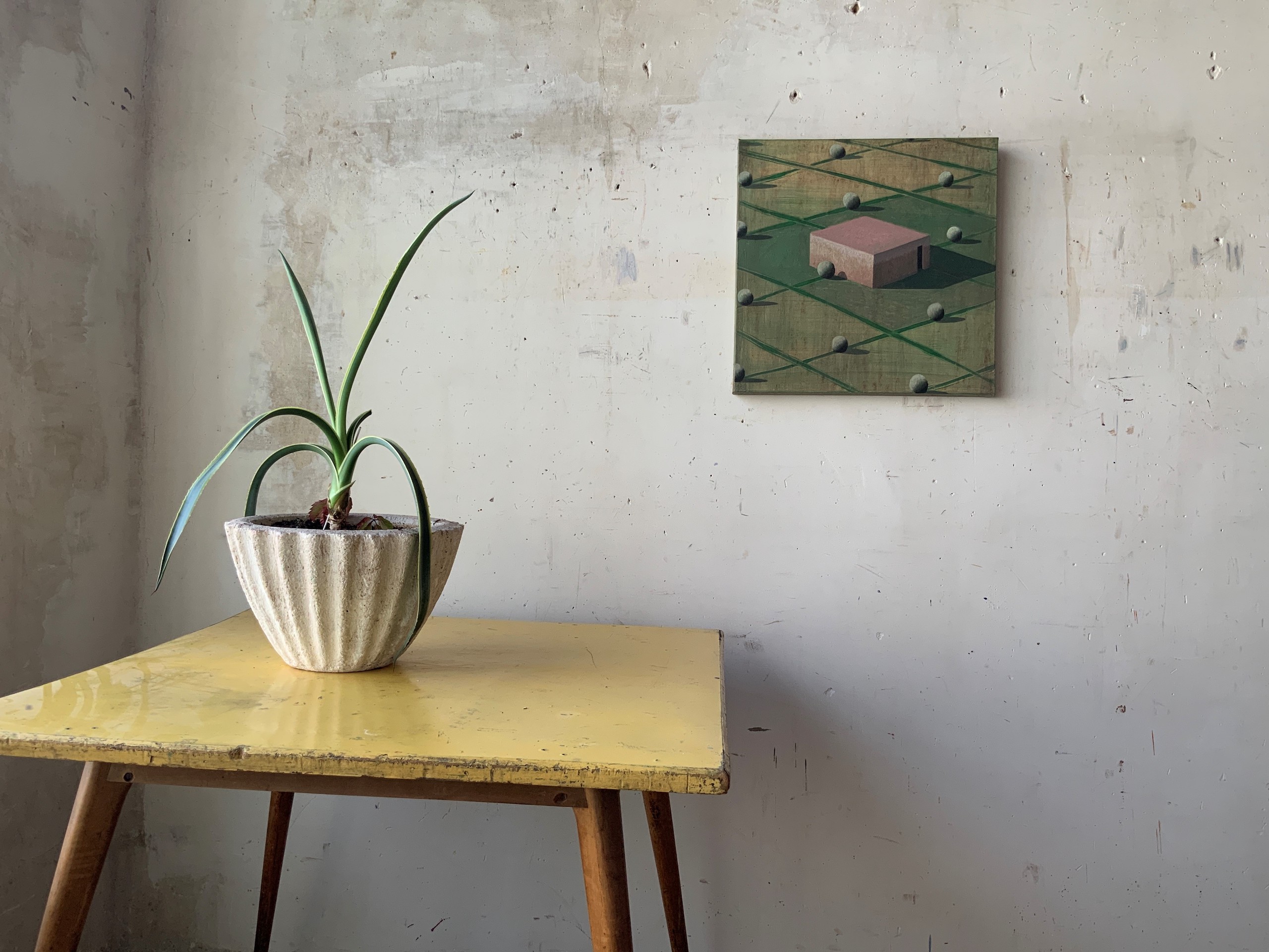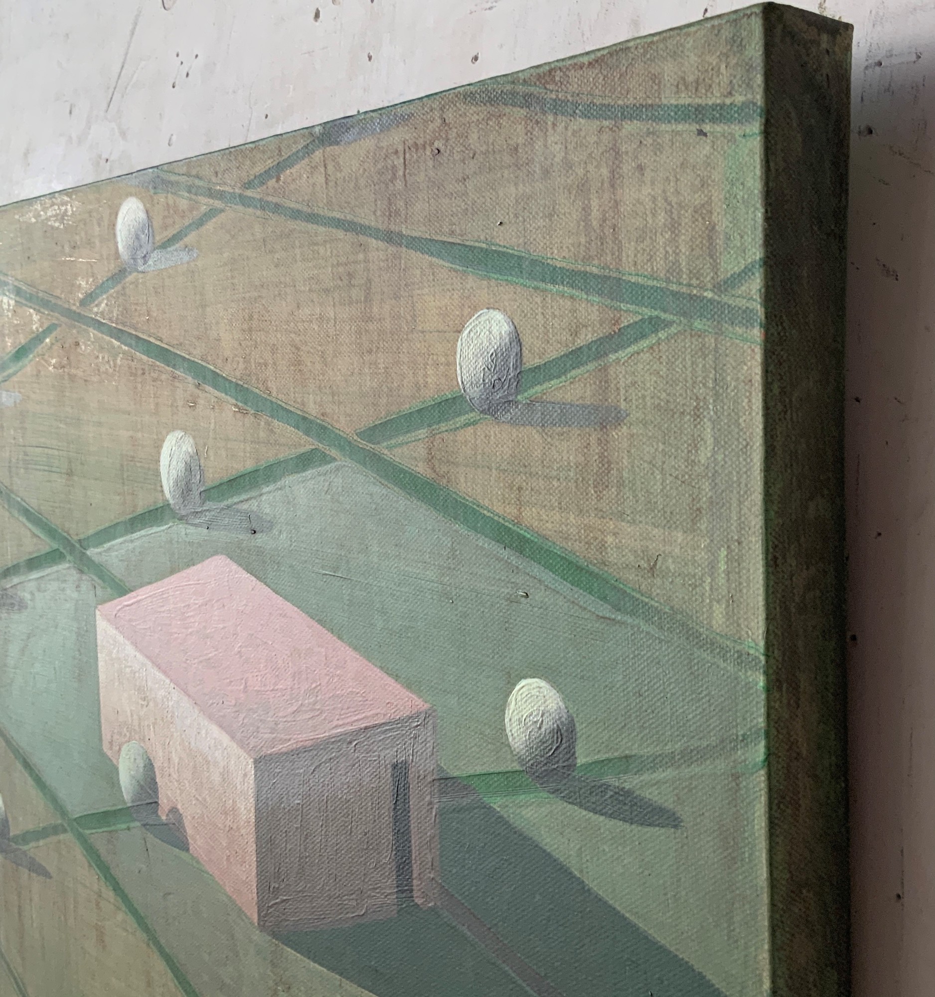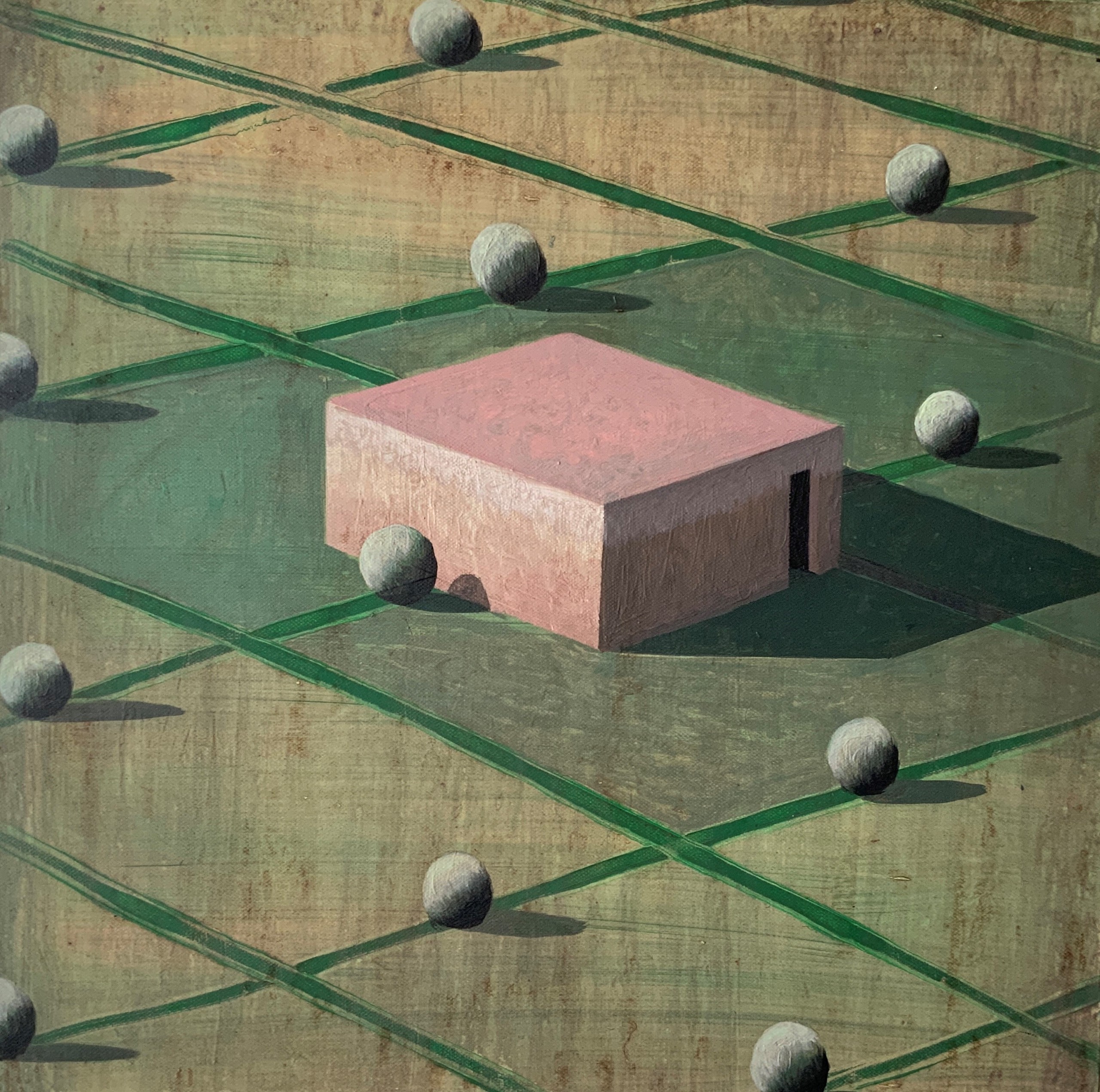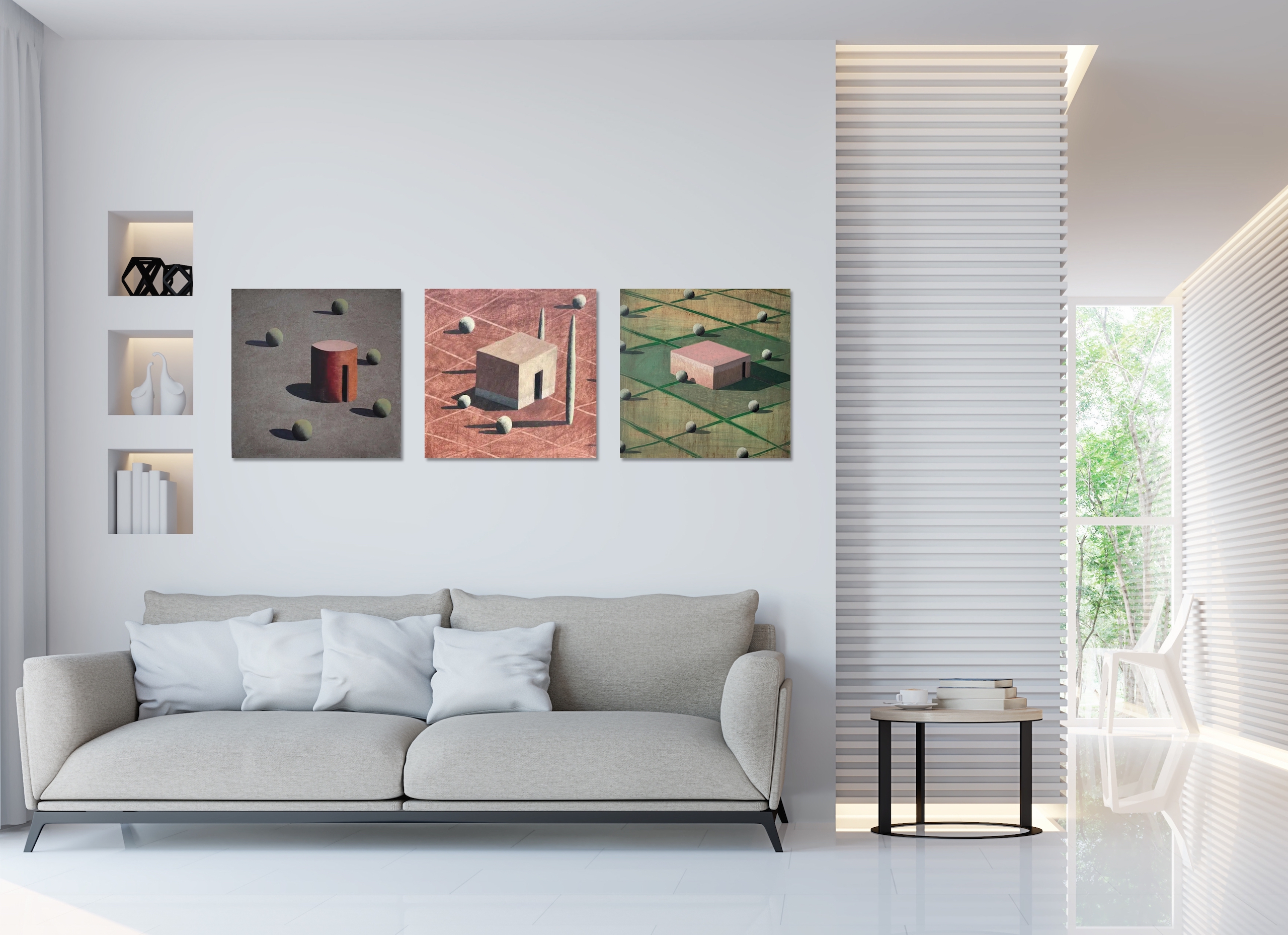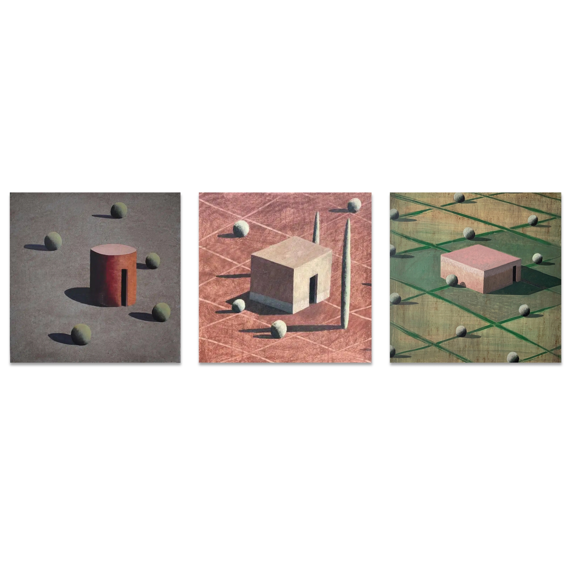 Dans ses peintures, l’artiste établit un dialogue entre l’architecture et le paysage, dans une figuration soumise à la géométrie et une atmosphère toujours énigmatique. La conception de ces espaces et la simplification des formes (poussée jusqu’aux limites de l’abstraction) traduisent une conception théâtrale de l’architecture.