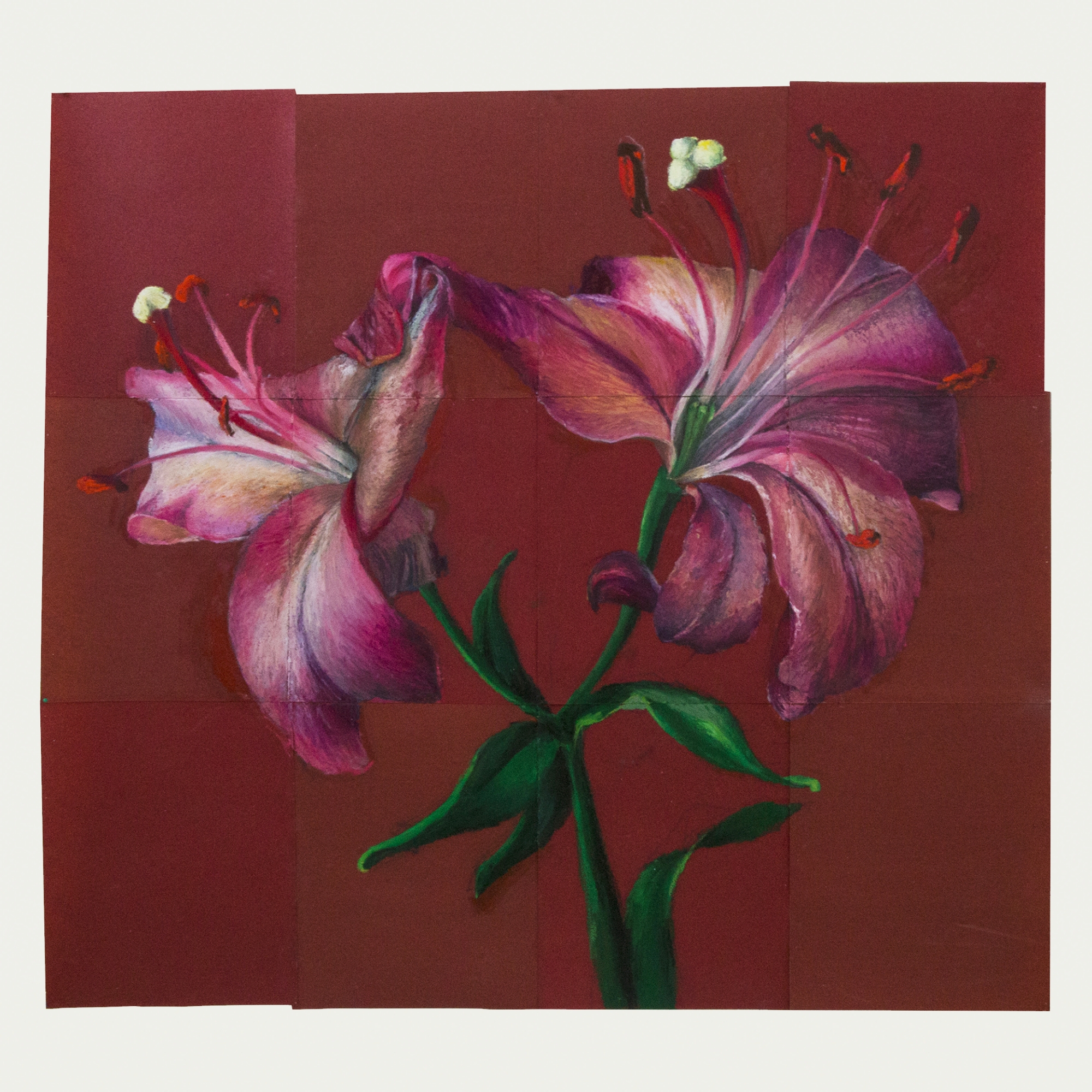 Cette œuvre représente deux lys de couleur rose dessinés au pastel à l’huile et au crayon sur des feuilles de papier de verre rouge collées les unes aux autres. L’œuvre sera vendue encadrée. Le prix comprend le cadre, mais les dimensions indiquées sont celles de l’œuvre pas encadrée (veuillez nous contacter pour plus d’informations).