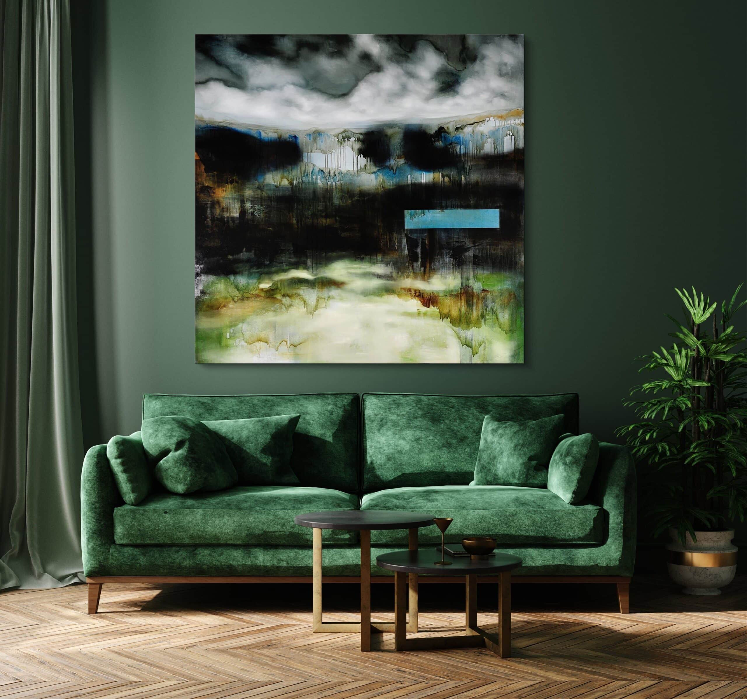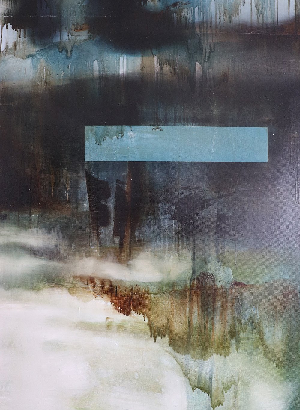 Cette peinture sur toile évoque un paysage abstrait. Sur un fond dénué de forme vient se superposer une forme géométrique de couleur bleu plus ou moins transparente. La scène est représentée avec une palette de couleurs nuancées sur les différents tons de bleu et de vert, rendant la composition mystérieuse.
