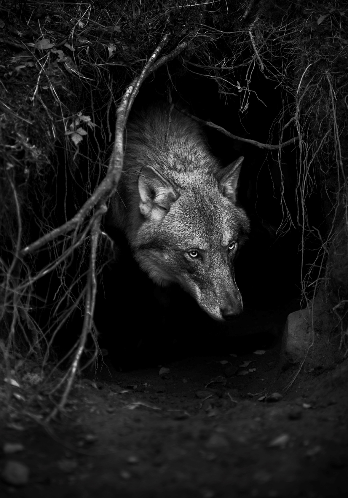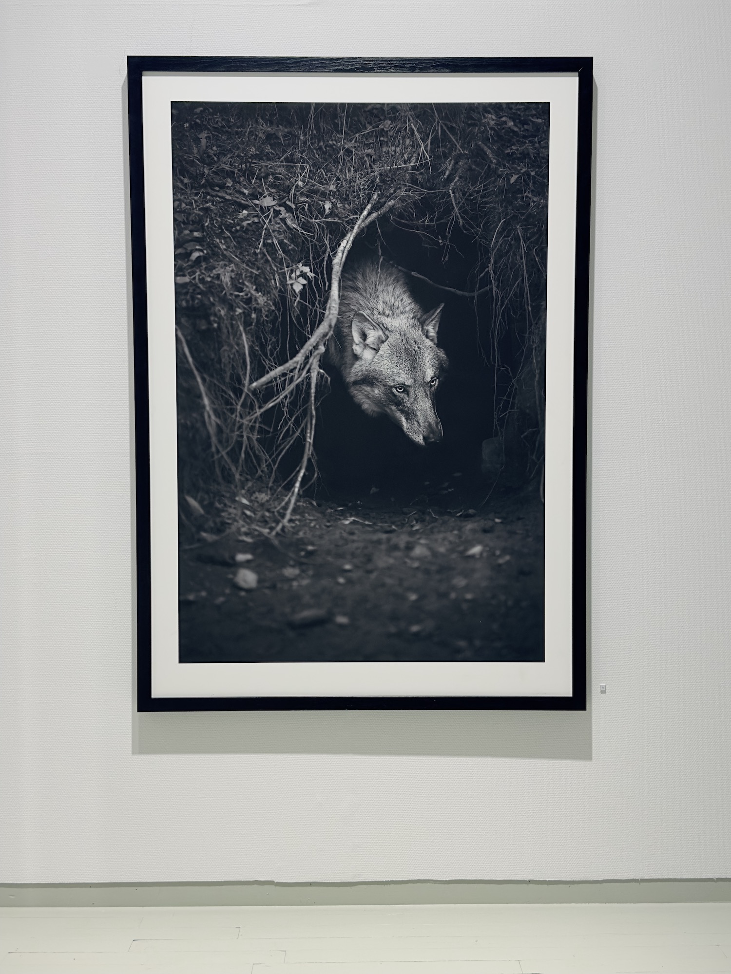 Untitled 9, Shadow within, Norway/USA est une œuvre du photographe contemporain Christian Houge issue de la série Shadow Within. Sur cette photographie en noir et blanc, un loup regarde dehors depuis sa tanière. Il regarde le spectateur non pas avec une attitude menaçante, mais plutôt bienveillante.