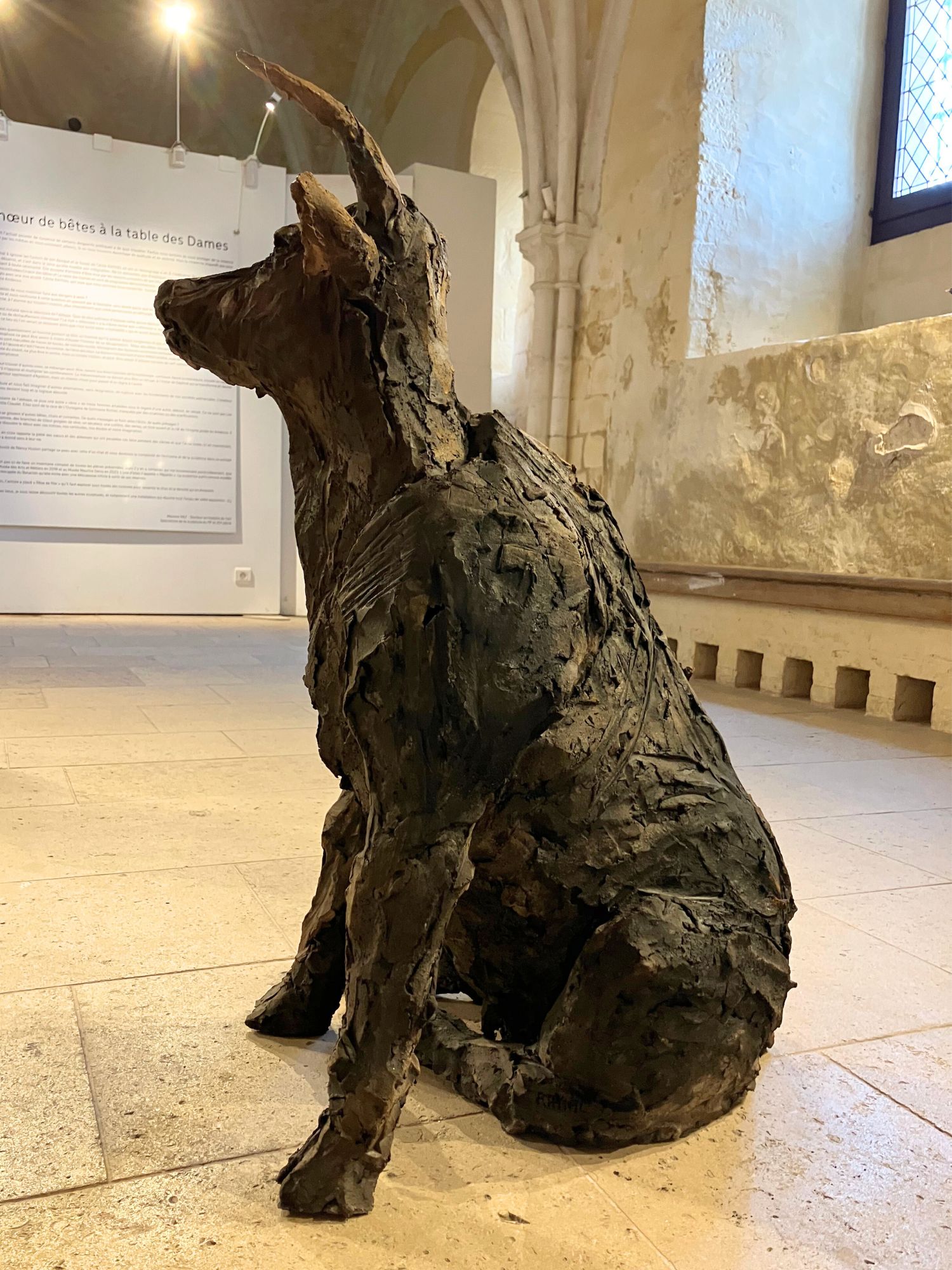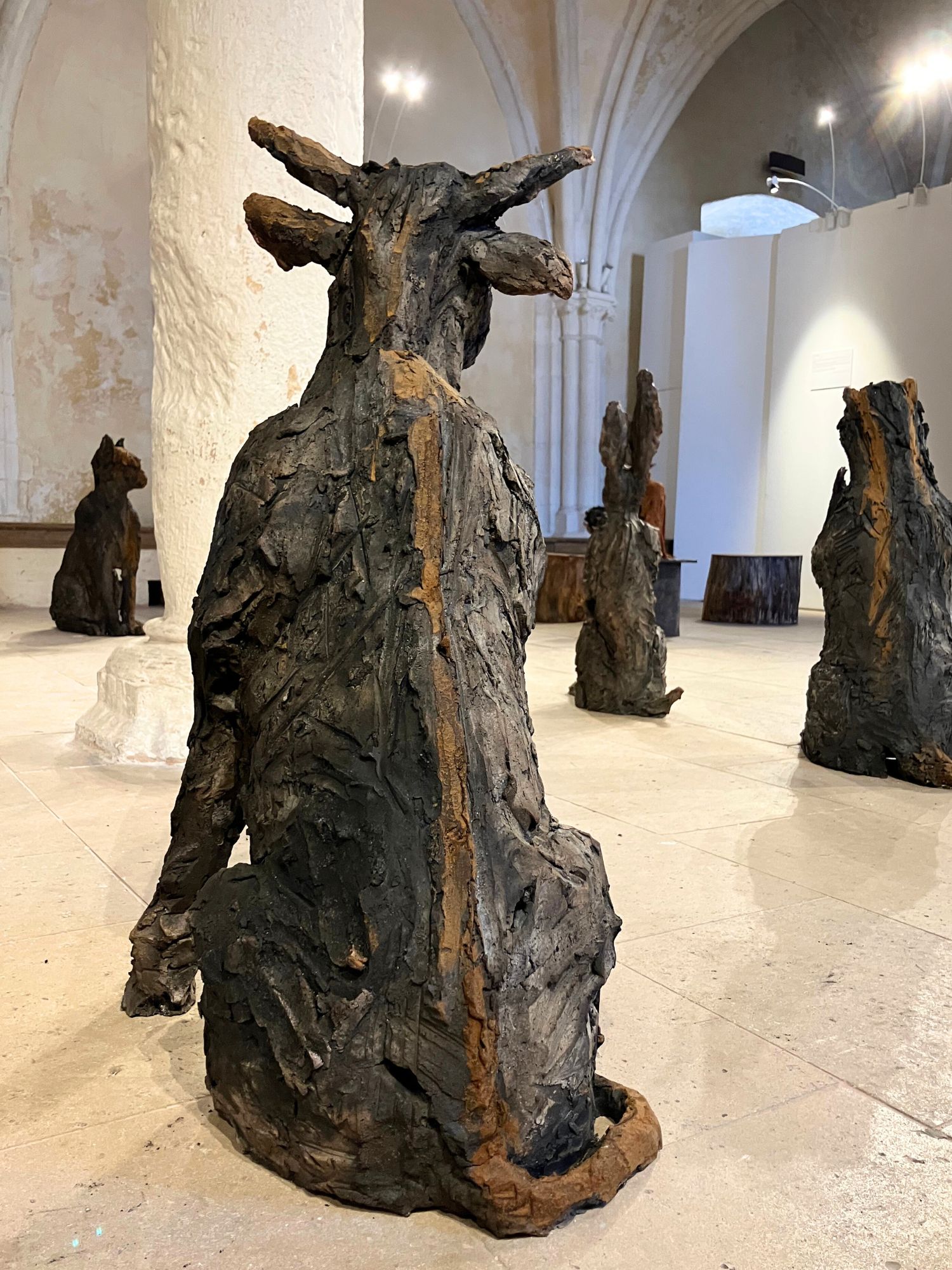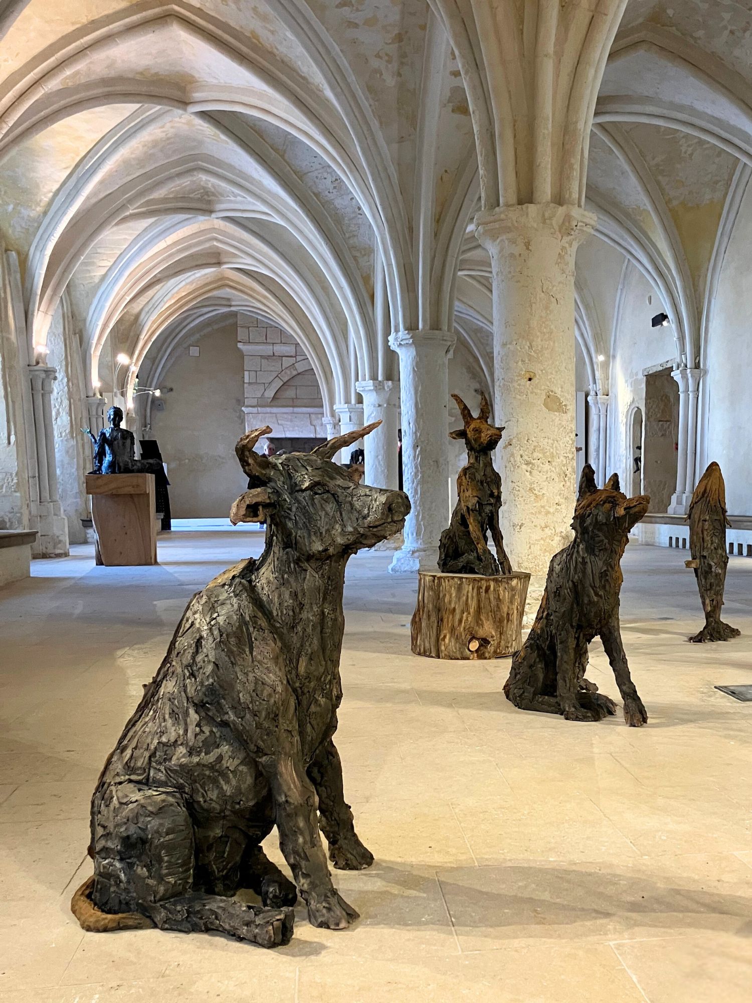L’installation Chœur de bêtes, à laquelle l’artiste travaille depuis plusieurs années, a été exposée à l’exposition personnelle de Cécile Raynal, À la table des Dames, à l’Abbaye de Montivilliers, en Normandie (2025). Dans ce lieu historique où vécurent il y a longtemps femmes, sœurs et abbesses, la sculptrice a choisi de présenter des œuvres réunissant portraits de femmes et de bêtes. Les sculptures de Cécile Raynal ne cherchent pas à séduire, elles peuvent même parfois paraître inquiétantes. Rugueuses, elles portent en elles les traces d’un passage par la matière, par l’épreuve, et pourtant elles se dressent, debout, vivantes. Elles convoquent un monde où la part animale, féminine, instinctive ou rebelle est assumée comme une force essentielle. Dans les espaces restaurés de l’Abbaye, l’exposition retrace les quinze dernières années du parcours singulier de l’artiste française (plus d’informations sur cette exposition ici).