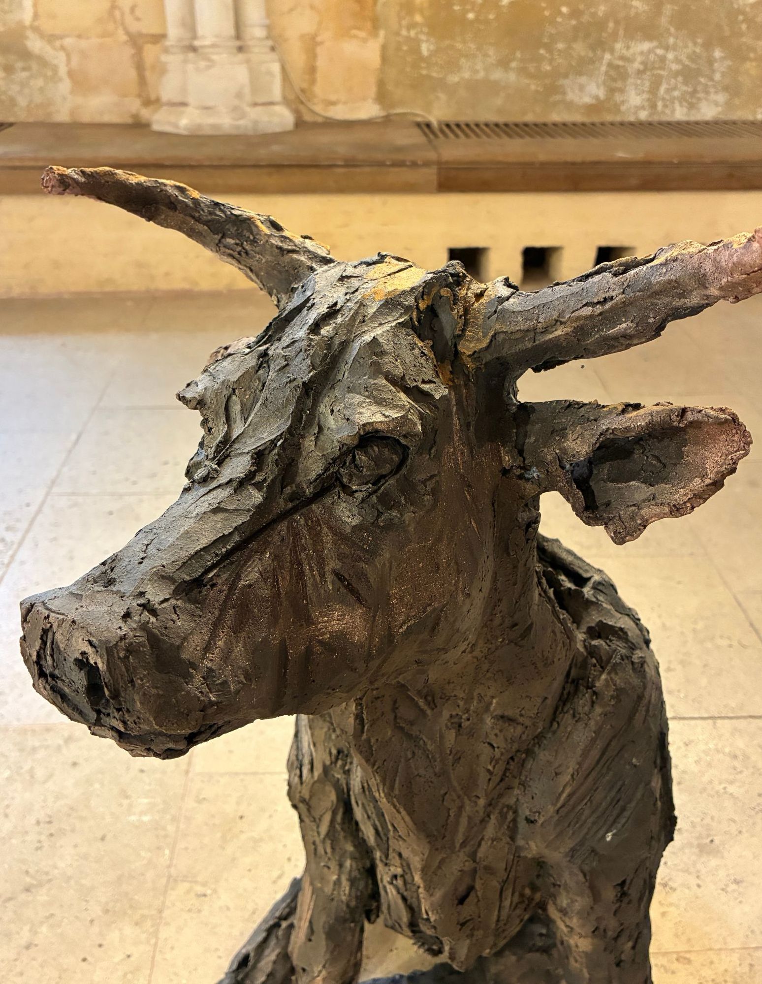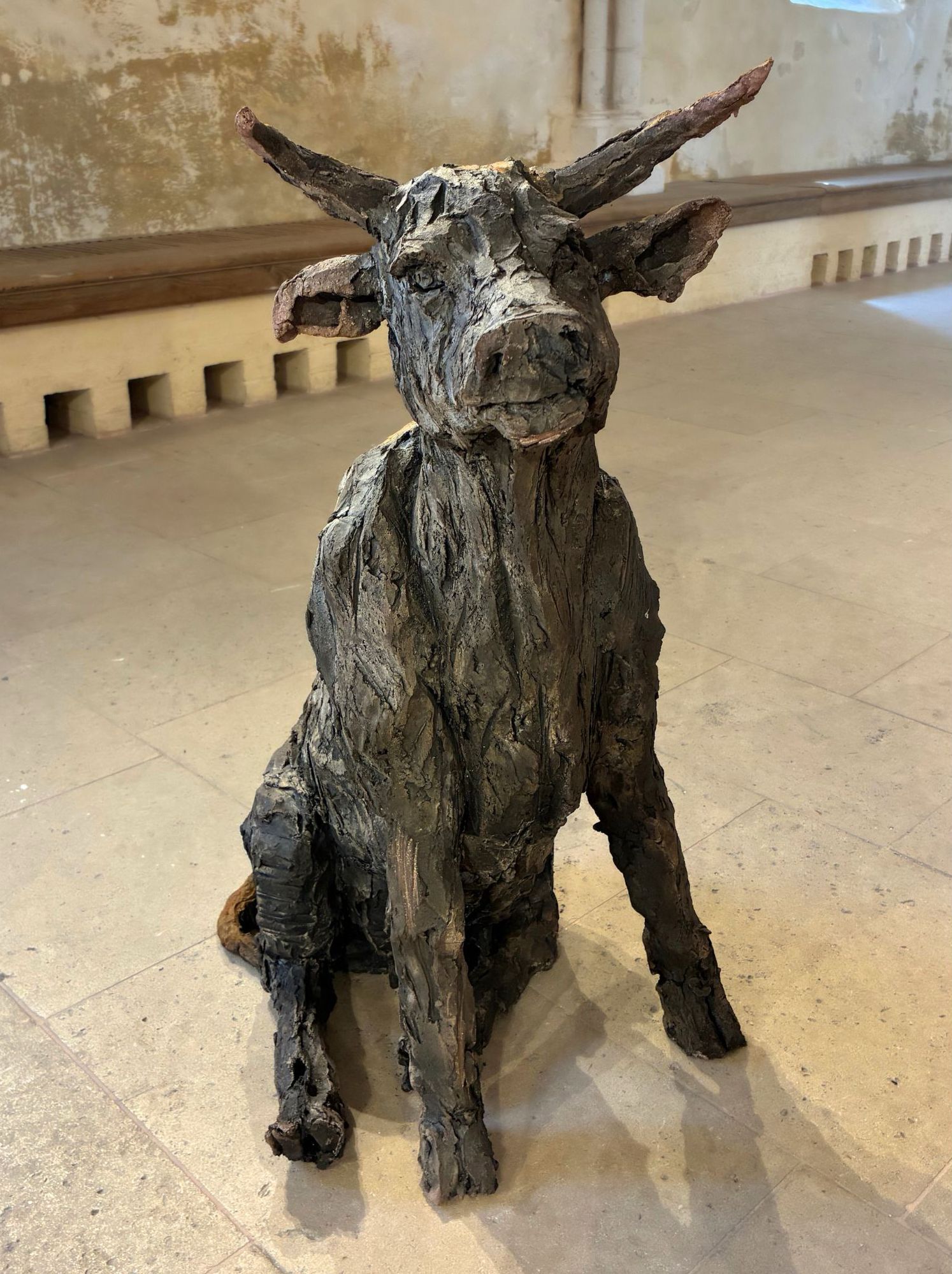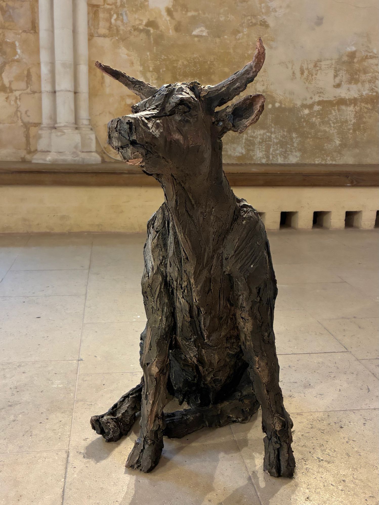 L’installation Chœur de bêtes, à laquelle l’artiste travaille depuis plusieurs années, a été exposée à l’exposition personnelle de Cécile Raynal, À la table des Dames, à l’Abbaye de Montivilliers, en Normandie (2025). Dans ce lieu historique où vécurent il y a longtemps femmes, sœurs et abbesses, la sculptrice a choisi de présenter des œuvres réunissant portraits de femmes et de bêtes. Les sculptures de Cécile Raynal ne cherchent pas à séduire, elles peuvent même parfois paraître inquiétantes. Rugueuses, elles portent en elles les traces d’un passage par la matière, par l’épreuve, et pourtant elles se dressent, debout, vivantes. Elles convoquent un monde où la part animale, féminine, instinctive ou rebelle est assumée comme une force essentielle. Dans les espaces restaurés de l’Abbaye, l’exposition retrace les quinze dernières années du parcours singulier de l’artiste française (plus d’informations sur cette exposition ici).