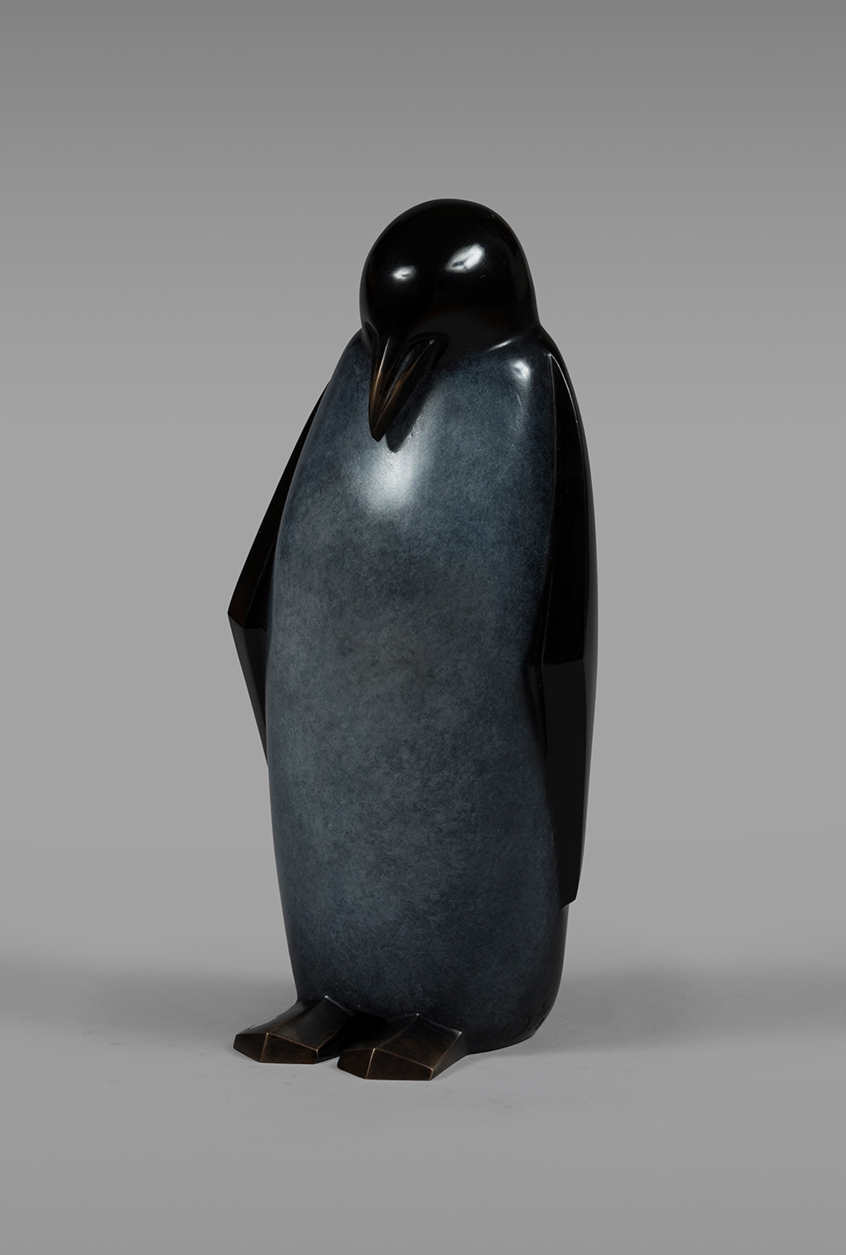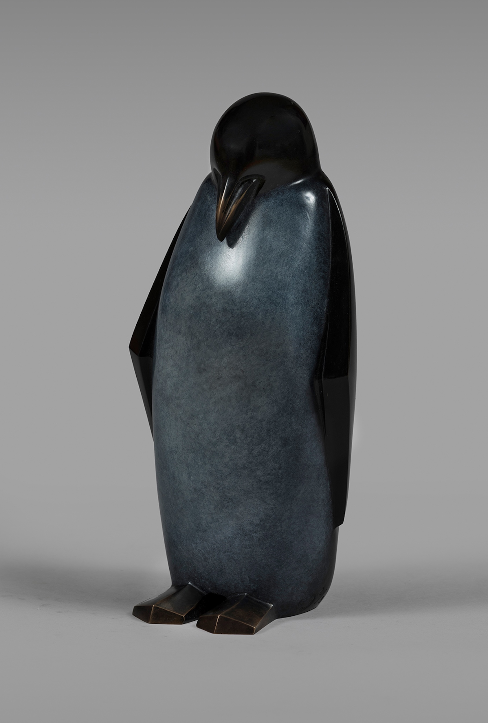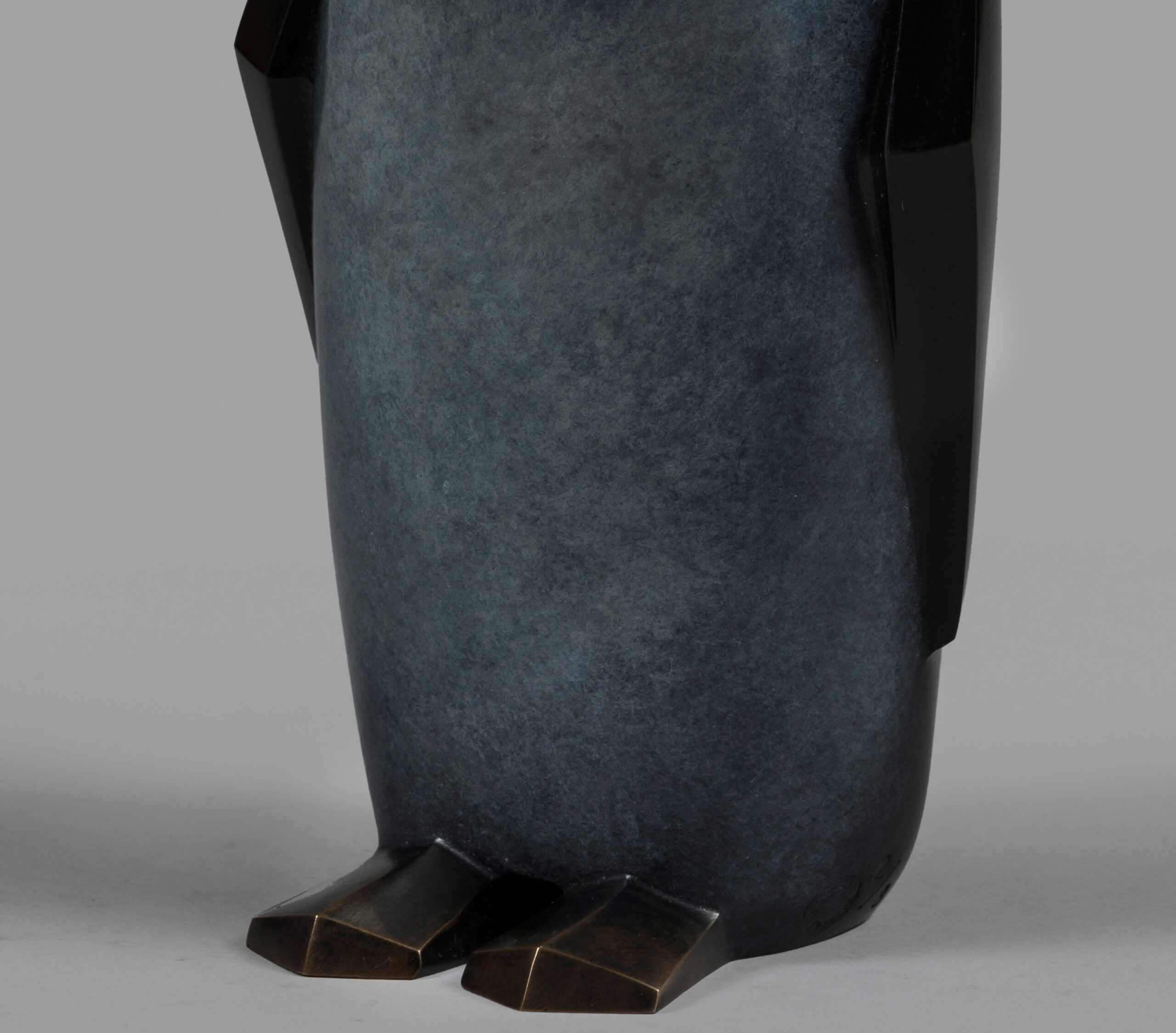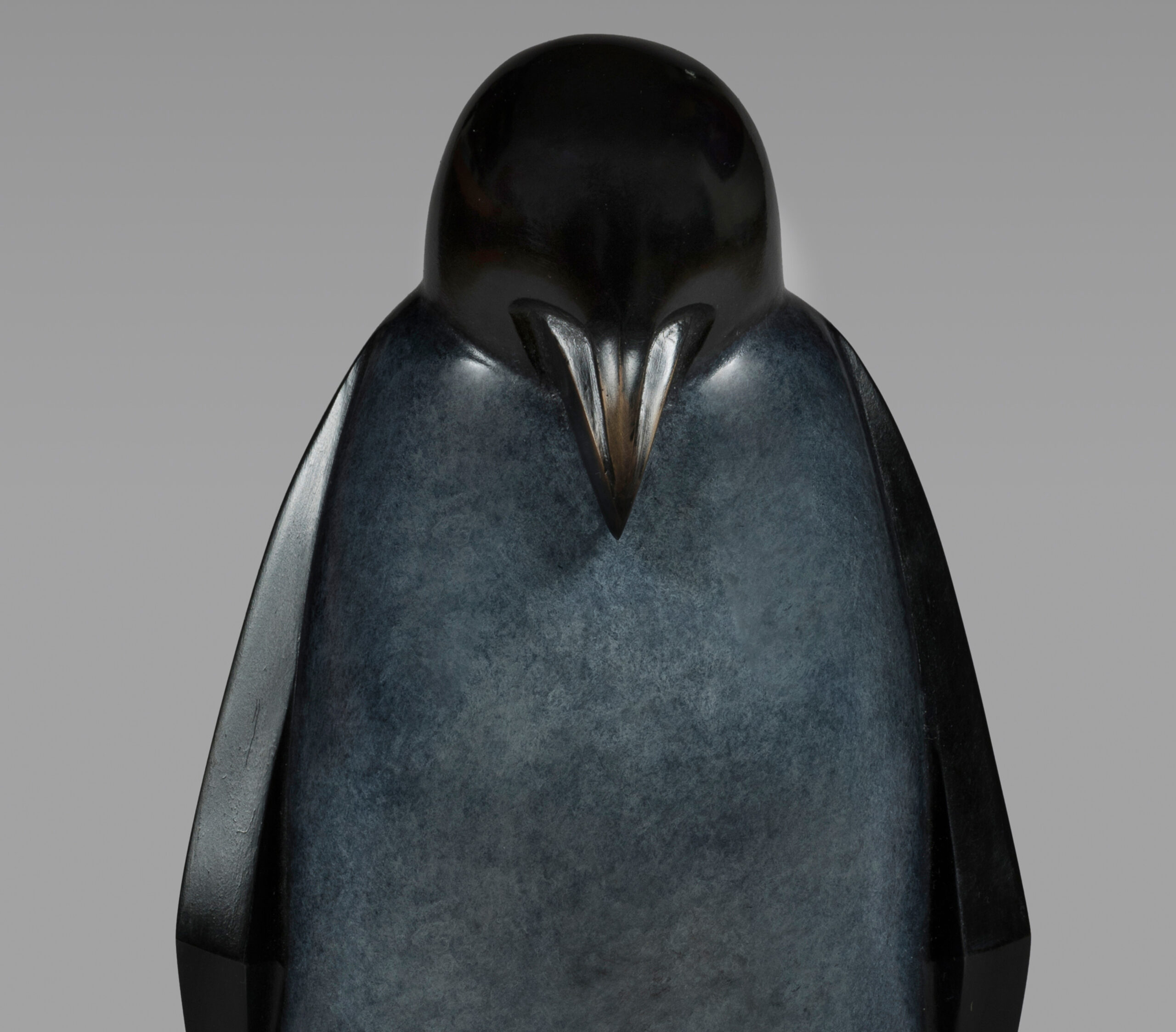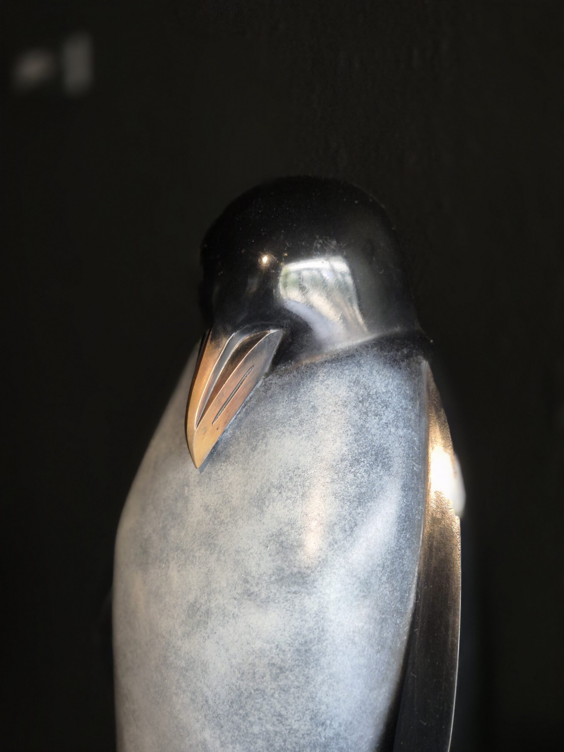 La sculpture met en valeur la silhouette classique du manchot : la tête et le dos, très polis et presque noirs, contrastent magnifiquement avec le bronze patiné gris bleuté et subtil de son ventre, créant une représentation à la fois naturaliste et stylisée.