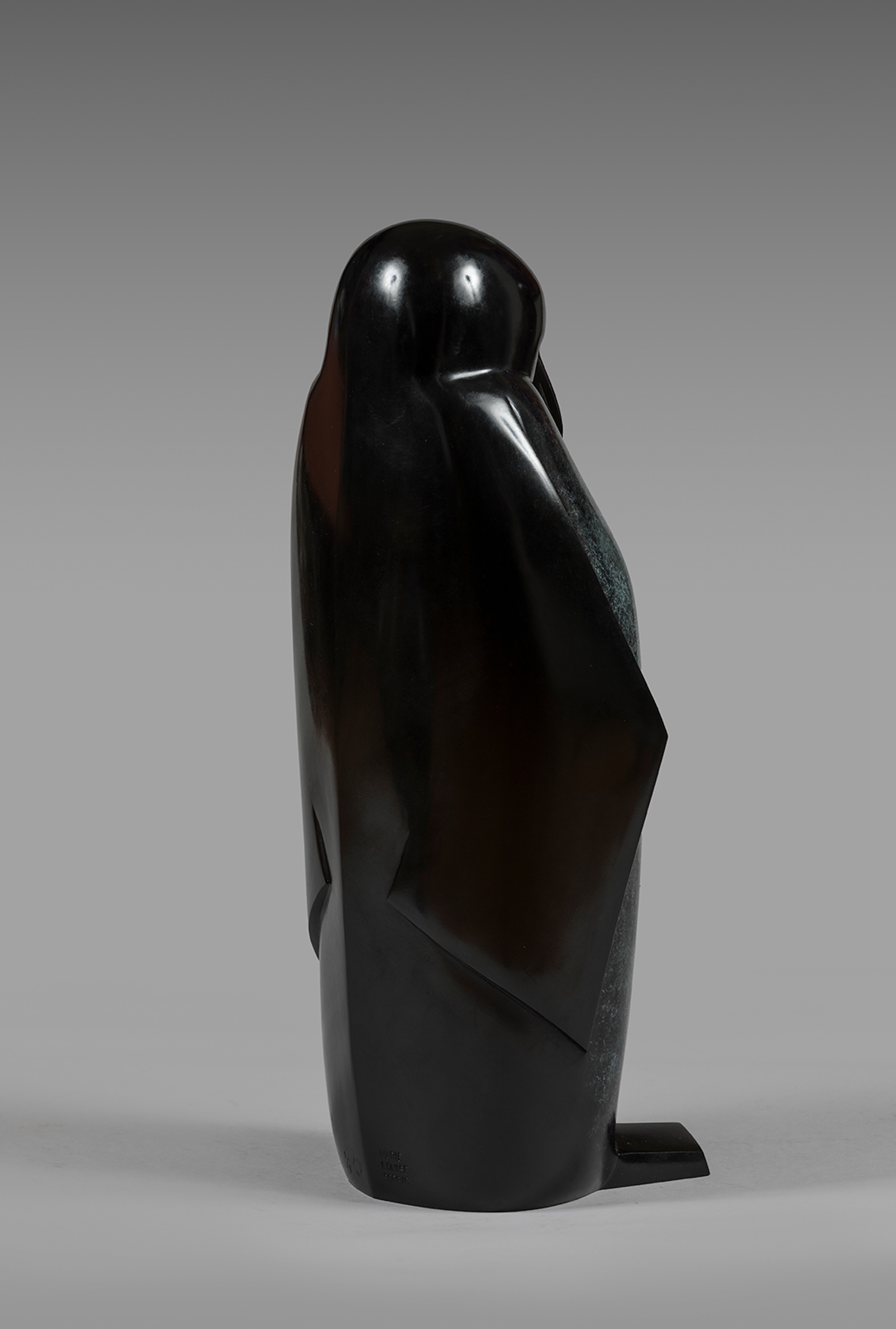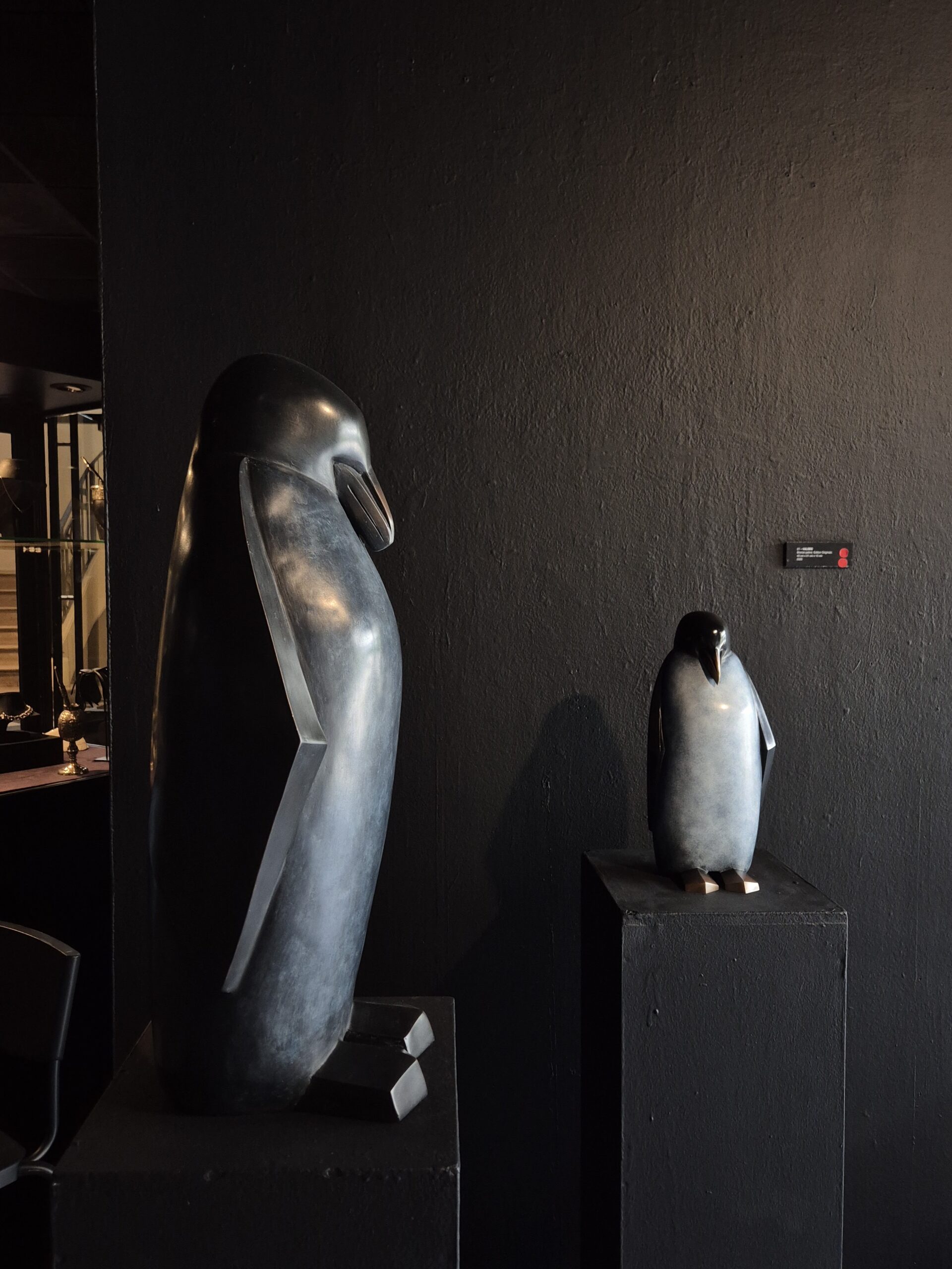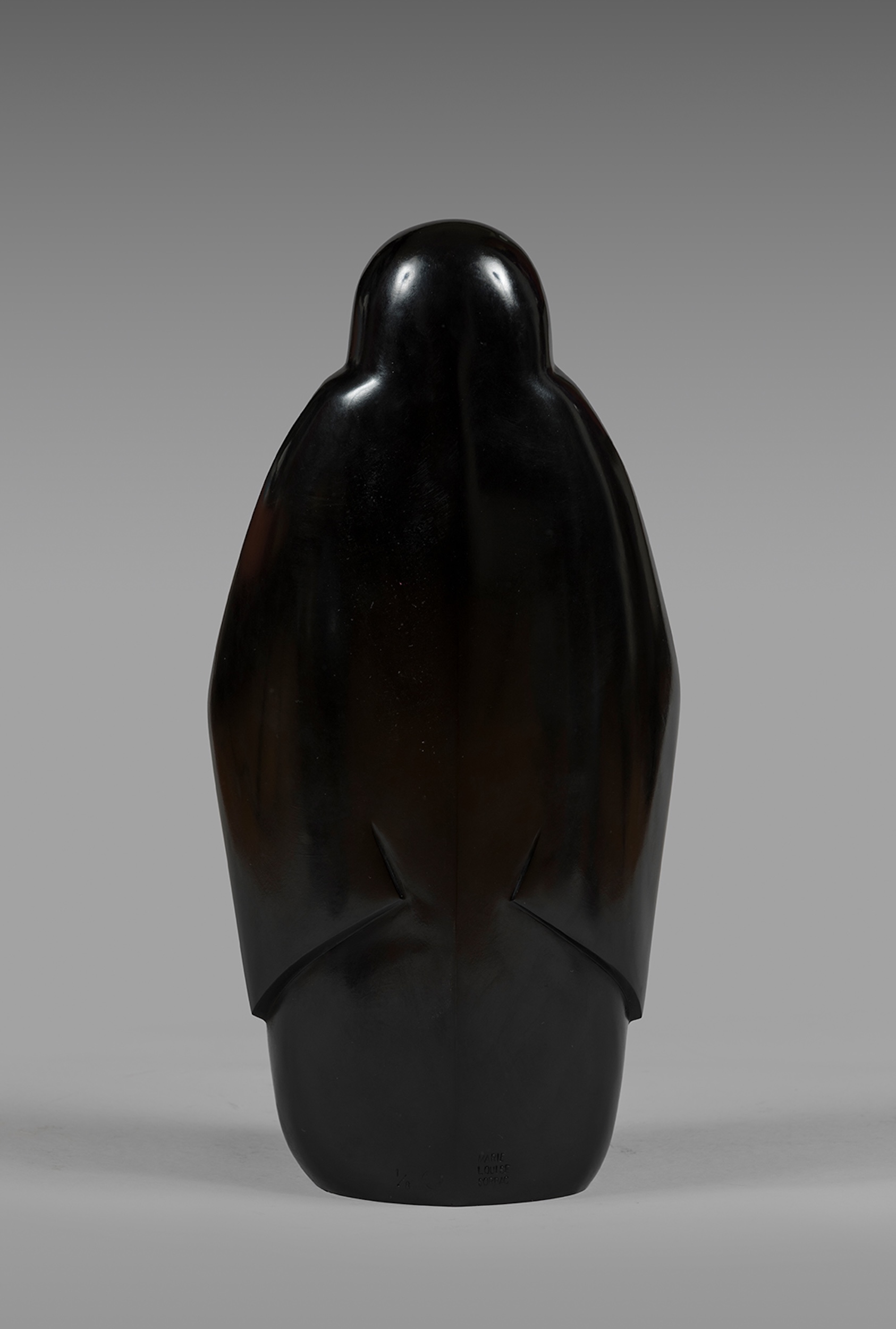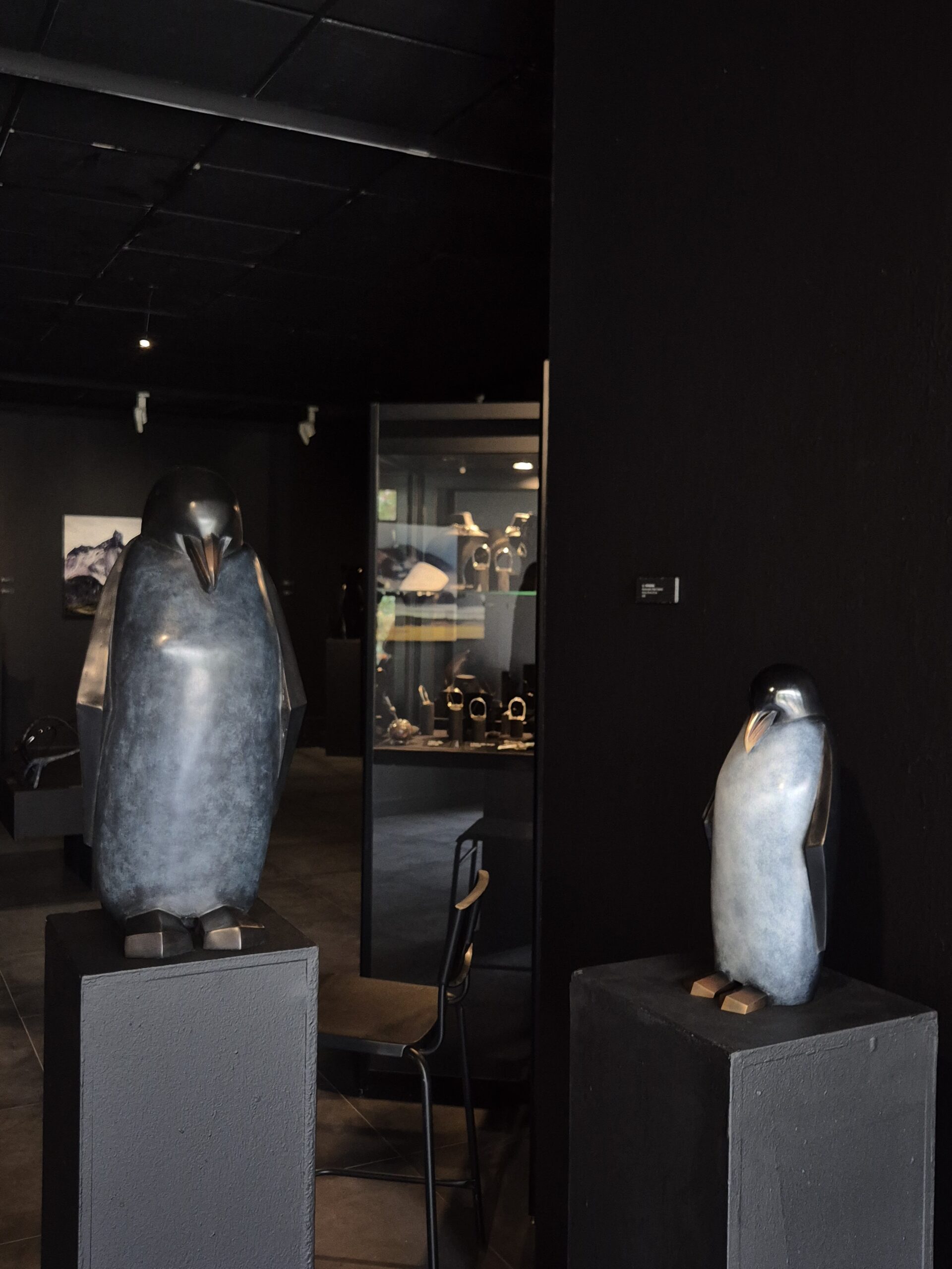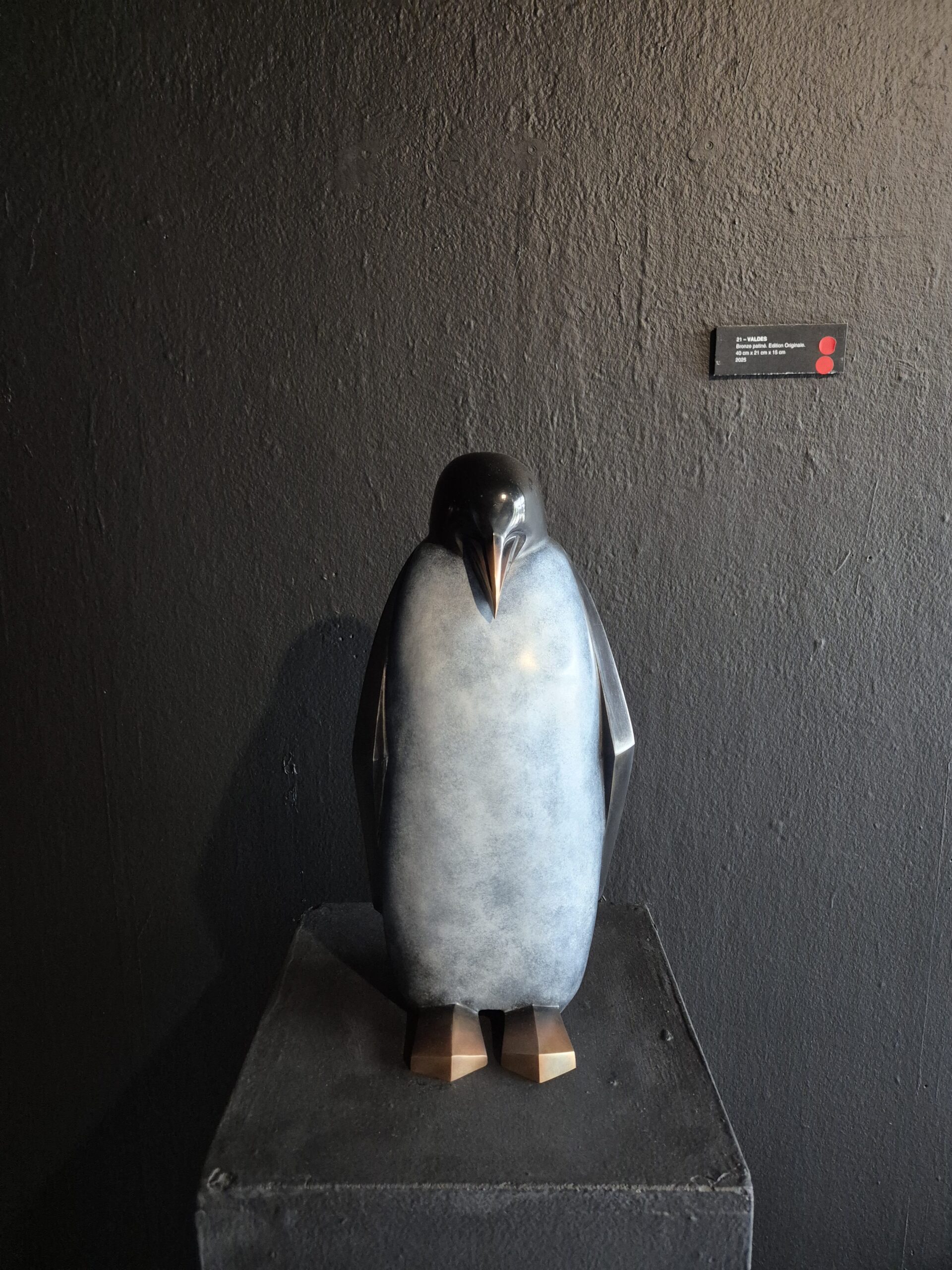 La sculpture met en valeur la silhouette classique du manchot : la tête et le dos, très polis et presque noirs, contrastent magnifiquement avec le bronze patiné gris bleuté et subtil de son ventre, créant une représentation à la fois naturaliste et stylisée.