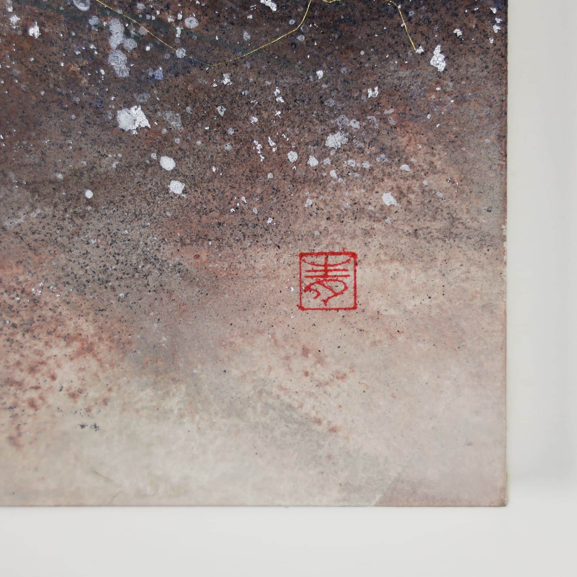 | Description | Pigments minéraux, feuilles d'or et d’argent sur papier japonais marouflé sur bois |