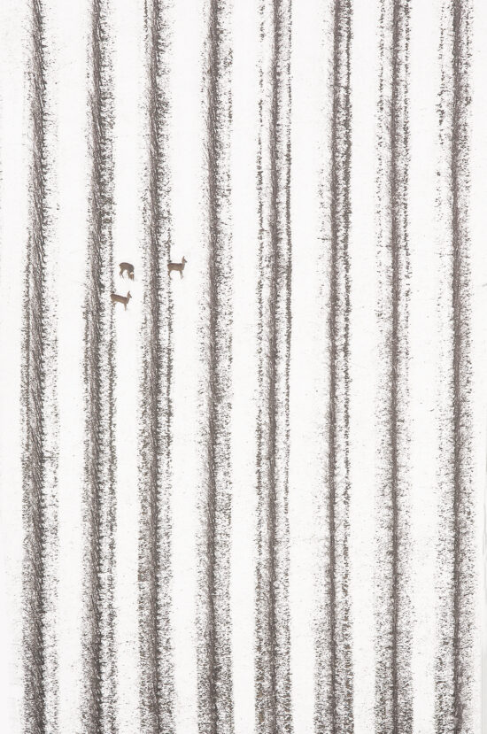 Dans cette série, les paysages hivernaux de la plaine du Pô, empreints de paix et de quiétude, sont montrés sous la neige et, parfois, dans le brouillard. Des arbres dénués de feuilles et des silhouettes d’animaux lointains se détachent sur les étendues blanches et silencieuses, dessinant des motifs graphiques et délicats. Sur certaines photographies, il est possible de voir au premier plan un aplat de couleur turquoise, ressemblant à une surface d’eau ; il s’agit en réalité de la fenêtre de la voiture du photographe. Comme souvent dans le travail de Riccardo Varini, on retrouve le concept du ‘seuil’, un point de vue qui permet de regarder au-delà, de contempler le silence, en instaurant un respect pour le paysage.