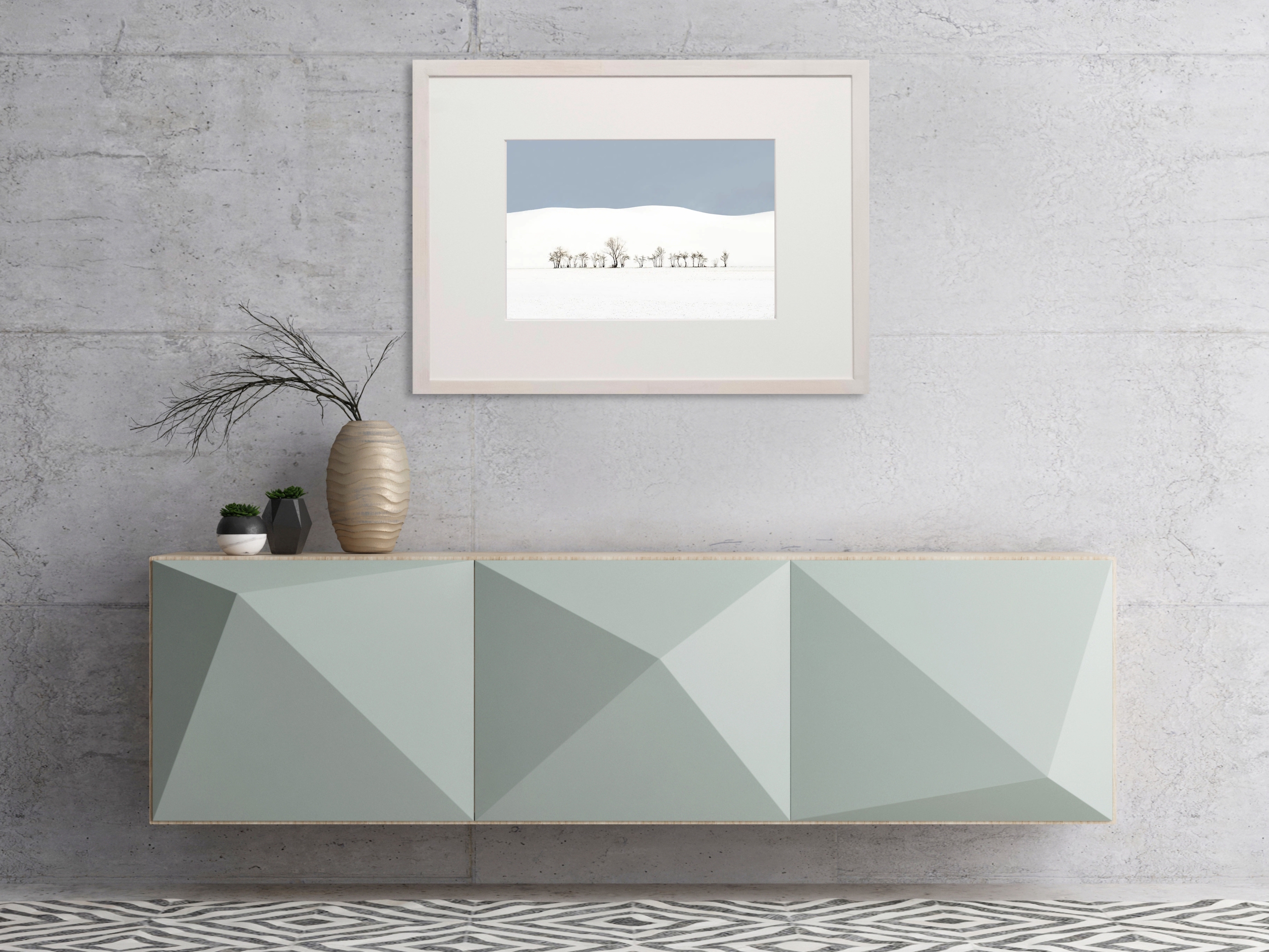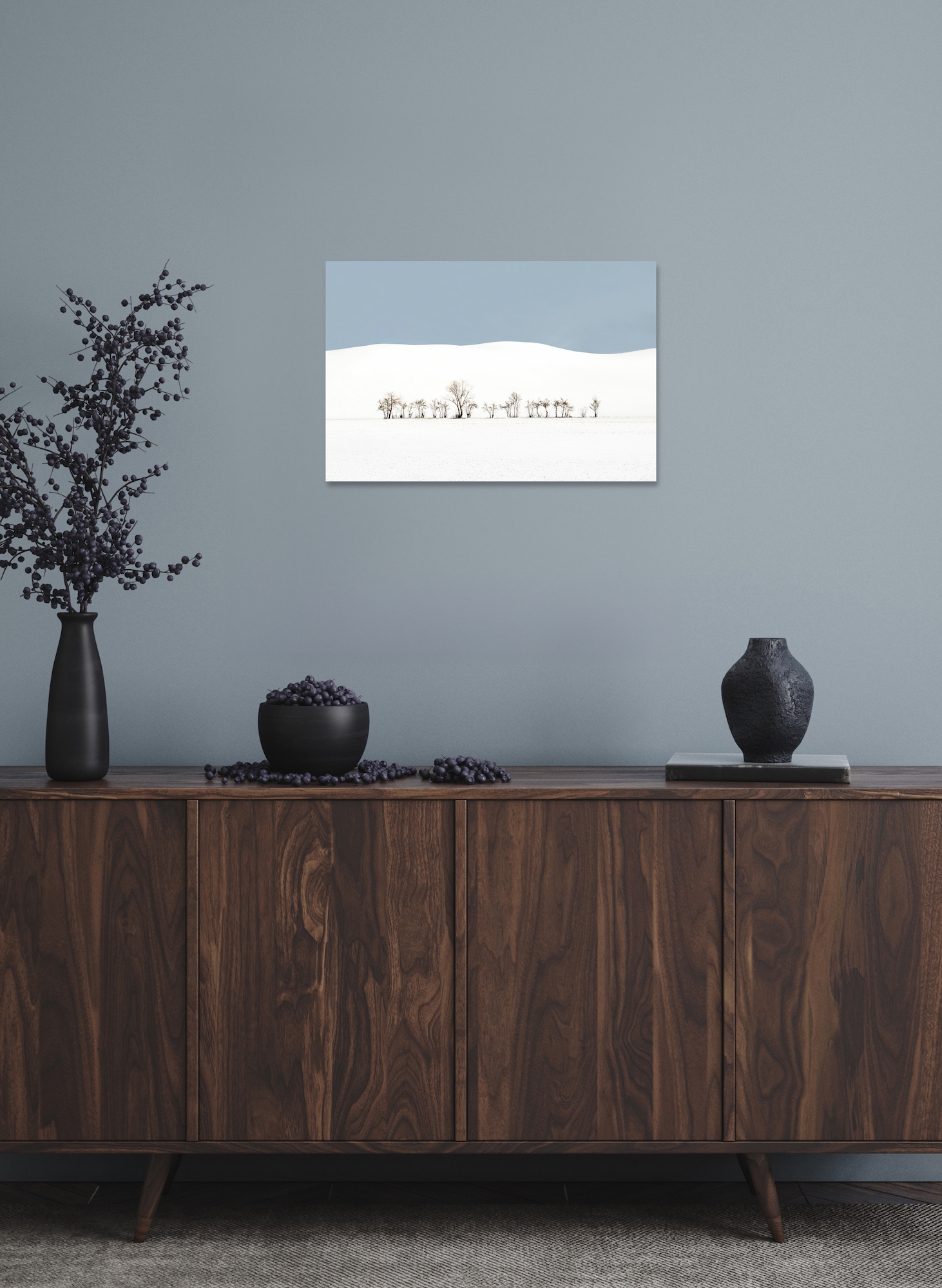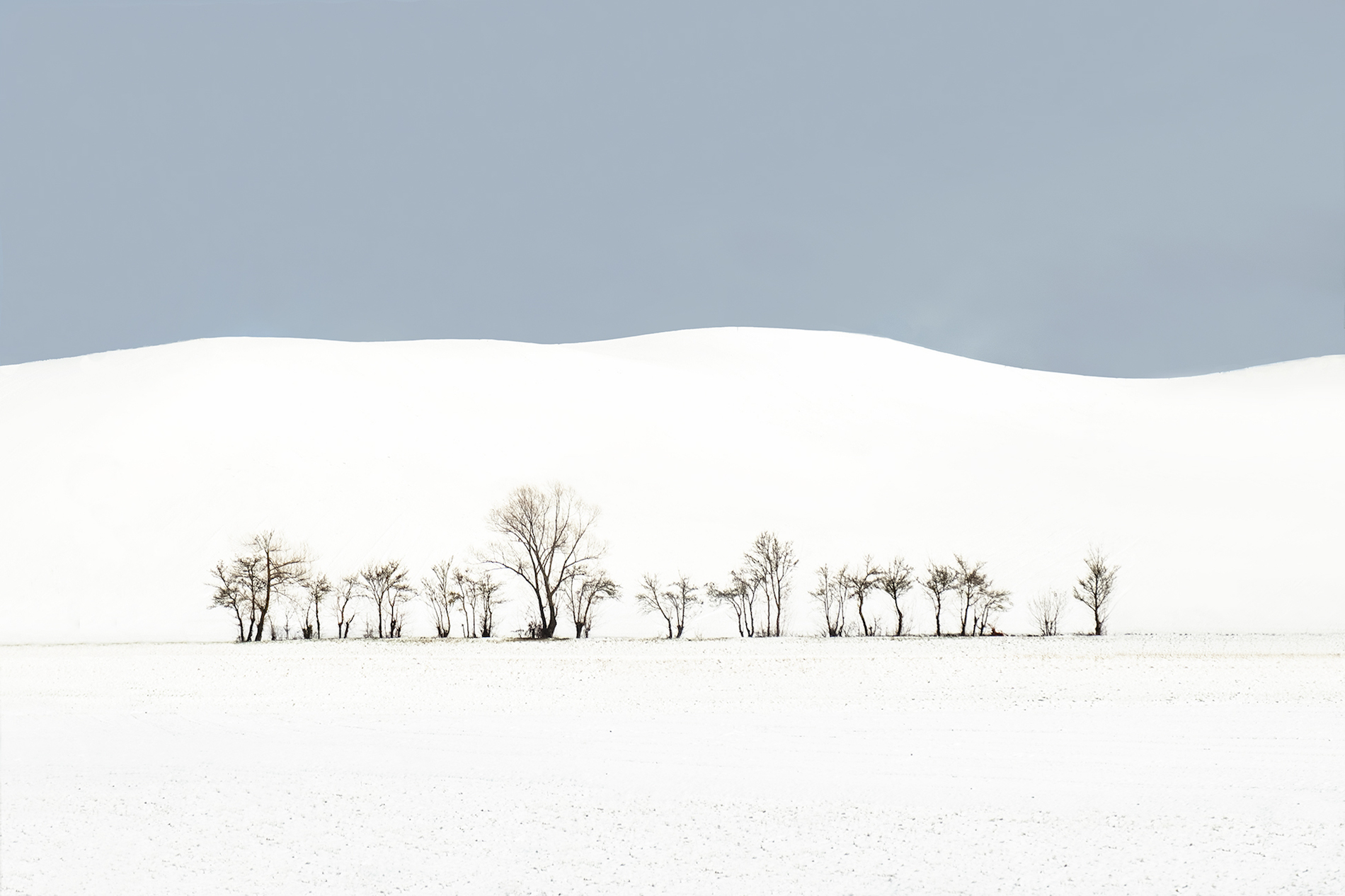 Dans cette série, les paysages hivernaux de la plaine du Pô, empreints de paix et de quiétude, sont montrés sous la neige et, parfois, dans le brouillard. Des arbres dénués de feuilles et des silhouettes d’animaux lointains se détachent sur les étendues blanches et silencieuses, dessinant des motifs graphiques et délicats. Sur certaines photographies, il est possible de voir au premier plan un aplat de couleur turquoise, ressemblant à une surface d’eau ; il s’agit en réalité de la fenêtre de la voiture du photographe. Comme souvent dans le travail de Riccardo Varini, on retrouve le concept du ‘seuil’, un point de vue qui permet de regarder au-delà, de contempler le silence, en instaurant un respect pour le paysage.