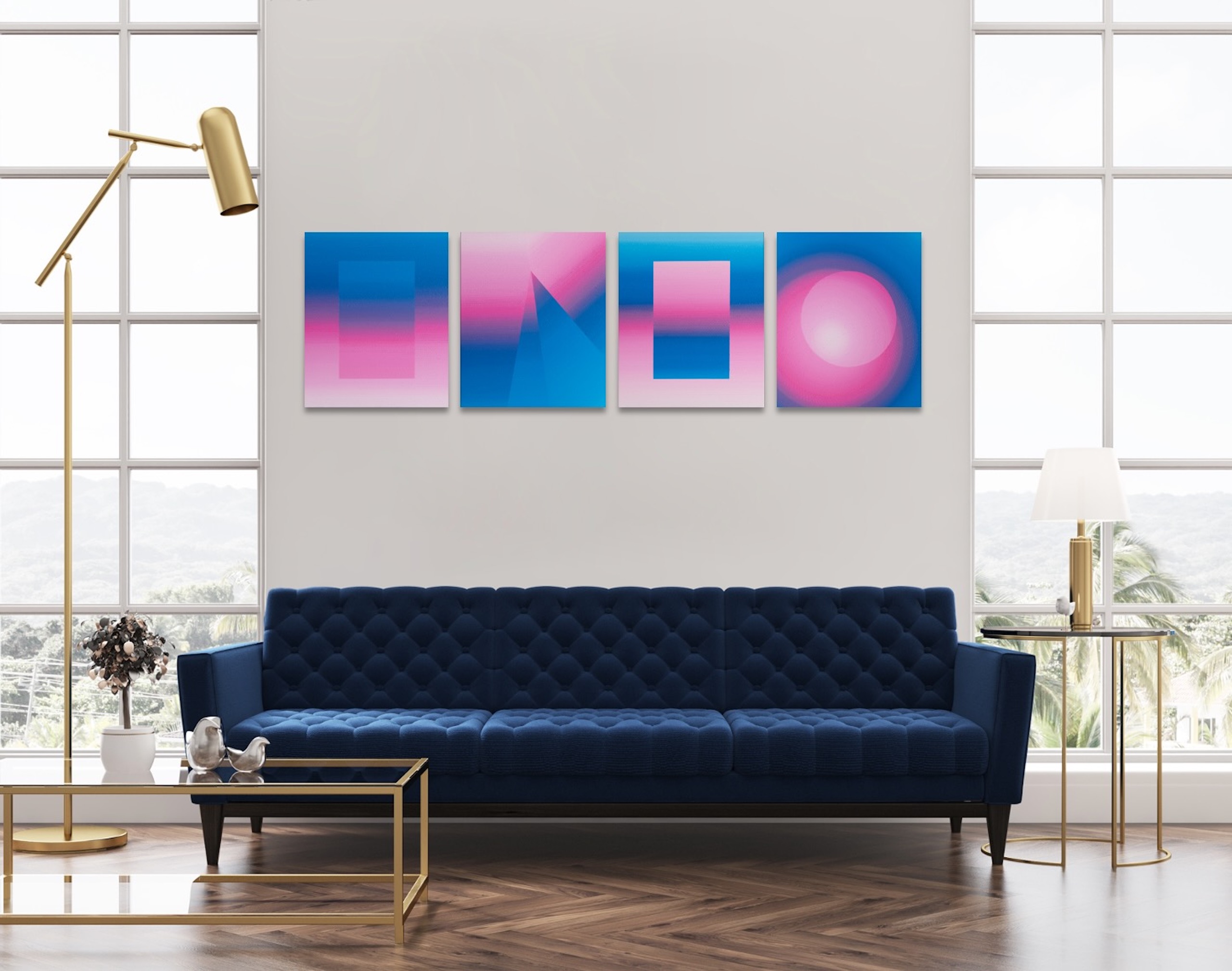 Les tableaux abstraits de l’artiste Mathieu Piffeteau explorent la diffusion de la lumière et les illusions d’optique à travers une combinaison harmonieuse de formes géométriques simples et universelles (des cercles, des carrés, des triangles…) avec des dégradés de couleurs peints à l’huile. Le résultat est une œuvre captivante qui dégage une énergie frémissante ; l’observateur est immergé dans une pure contemplation esthétique, une expérience sensorielle subjective et unique.