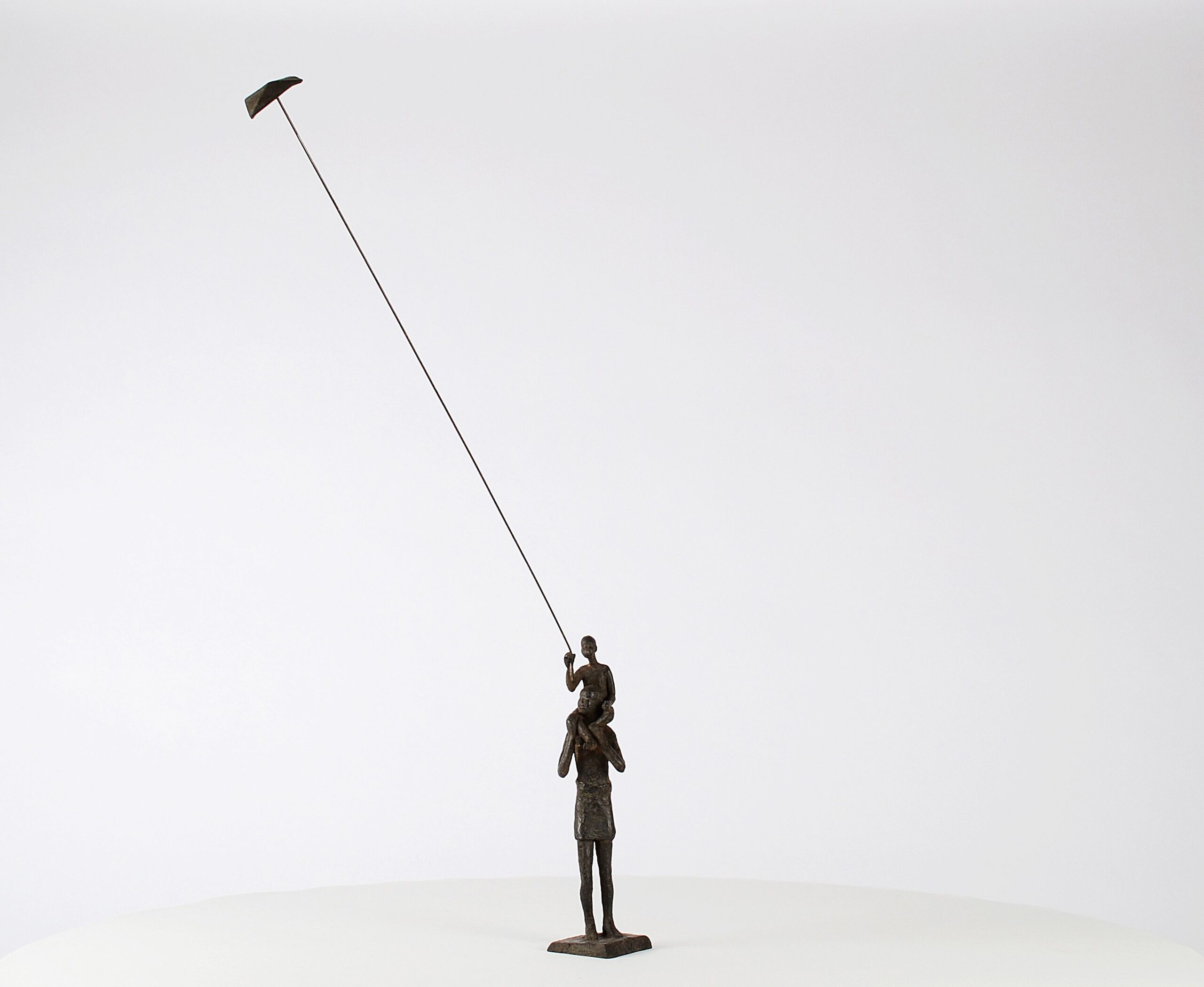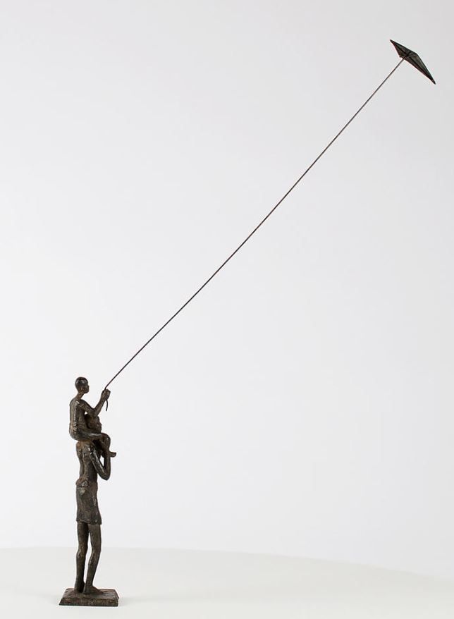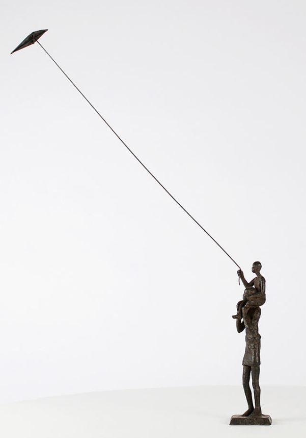 Voile d’enfance III est une sculpture en bronze de l’artiste contemporaine française Marine de Soos. Cette œuvre d’art figuratif à l’esthétique délicate et légère représente un homme debout simplement vêtu d’un pagne. Il tient sur ses épaules un enfant et fait voler un cerf-volant.