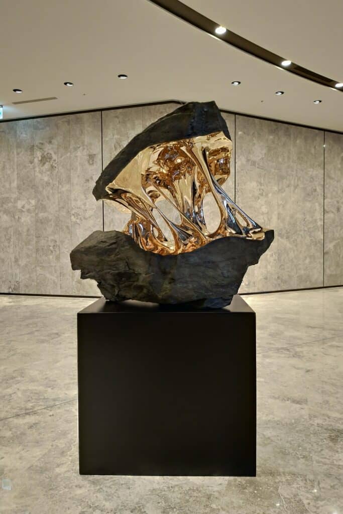 To offer visitors to its Paris flagship an exceptional experience, Unsaid jewelry house wanted to create a dialogue between its creations and those of contemporary artists whose approach is in harmony with the brand’s values. They chose Mattia Bosco and Romain Langlois from among the artists presented by Artistics, two creators with a mineral universe whose work is marked by a concern for sustainability and a reflection on the idea of transformation.