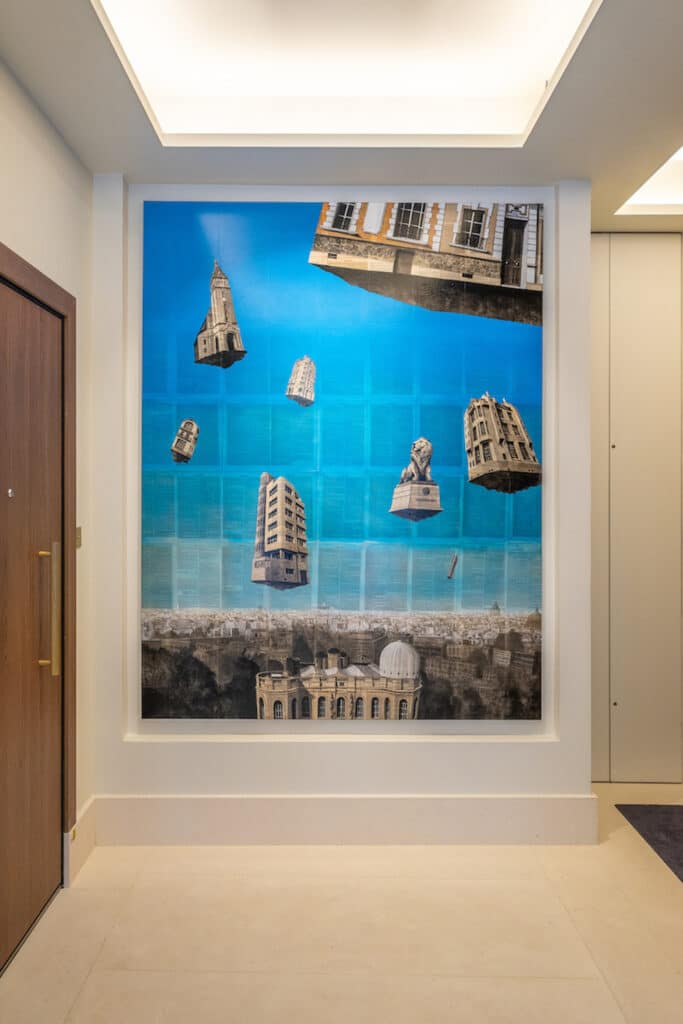 In collaboration with Guillaume Chansarel, the artist commissioned for the project, Artistics prepared a proposal and, once the final selection was made, coordinated its production from start to finish. Entitled Paris extramuros, this (2.2 m) 7.2 ft painting exquisitely creates a link between the modernity of the building and the iconic landmarks of its physical environment.