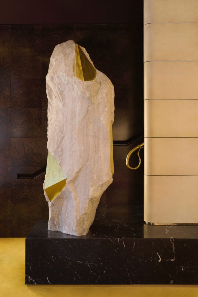 Mattia Bosco has created a monumental marble sculpture, partially enhanced with gold leaf, whose shapes and colors resonate with the space in which it is housed, designed by the architects at Dimore Studio. The bronze Sleeping Beauty, by Romain Langlois, is on show on the second floor of this former private mansion near Place Vendôme.
